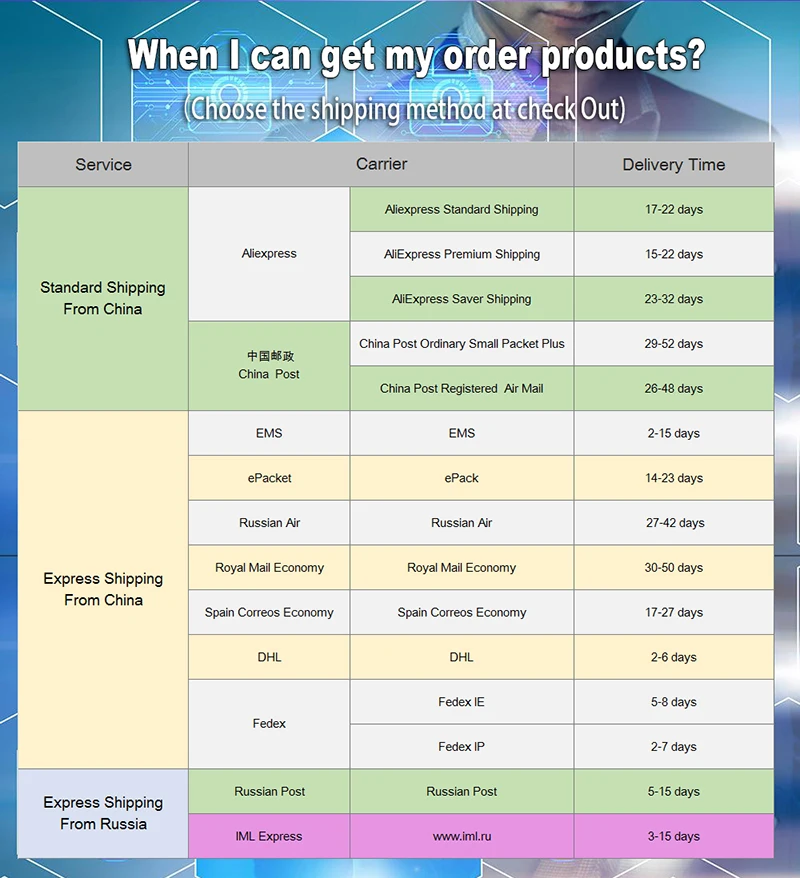 Packages from our warehouse in China will be shipped by ePacket or EMS depending on the weight and size of the product. Packages shipped from our US warehouse are shipped through USPS.