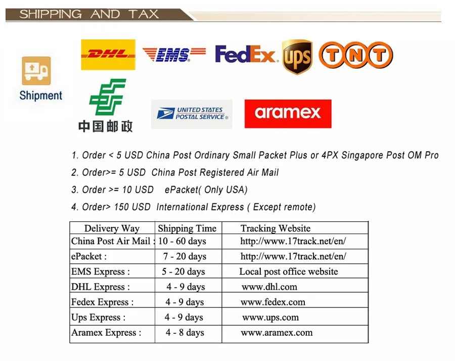 Packages from our warehouse in China will be shipped by ePacket or EMS depending on the weight and size of the product. Packages shipped from our US warehouse are shipped through USPS.