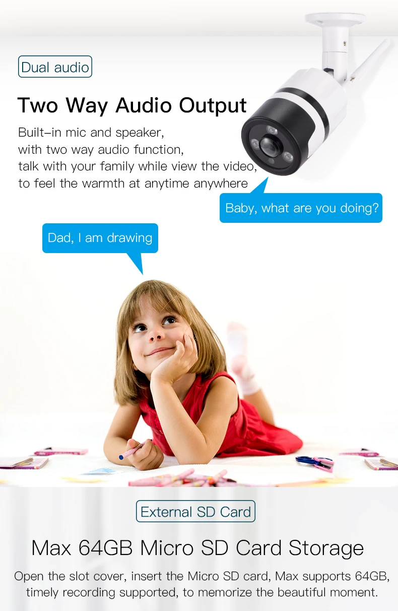 Support max 64G TF micro SD card(Not included). Support scheduled record, snapshot, Support Intelligent record playback remotely |