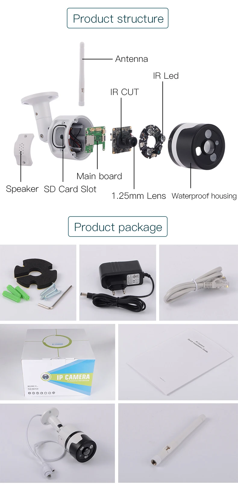 IP Camera, Power Adapter, Bracket, Screws, CD, Manual |