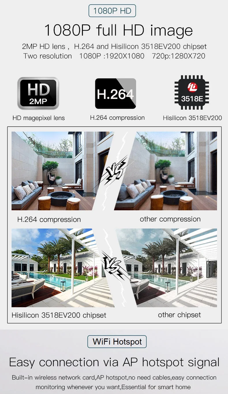 2.0 Megapixel, 1/2.7 1080P CMOS Image Sensor. Image Compression: H.264 |