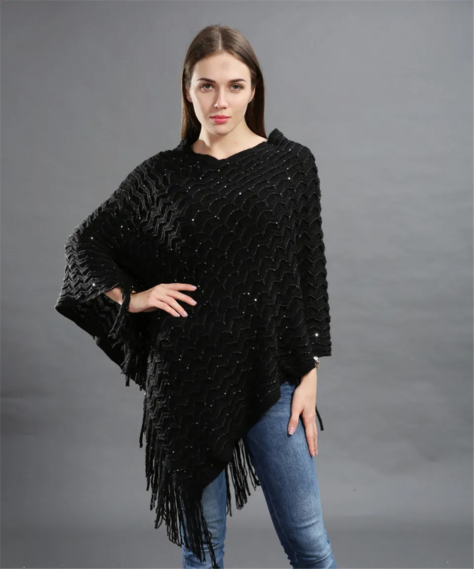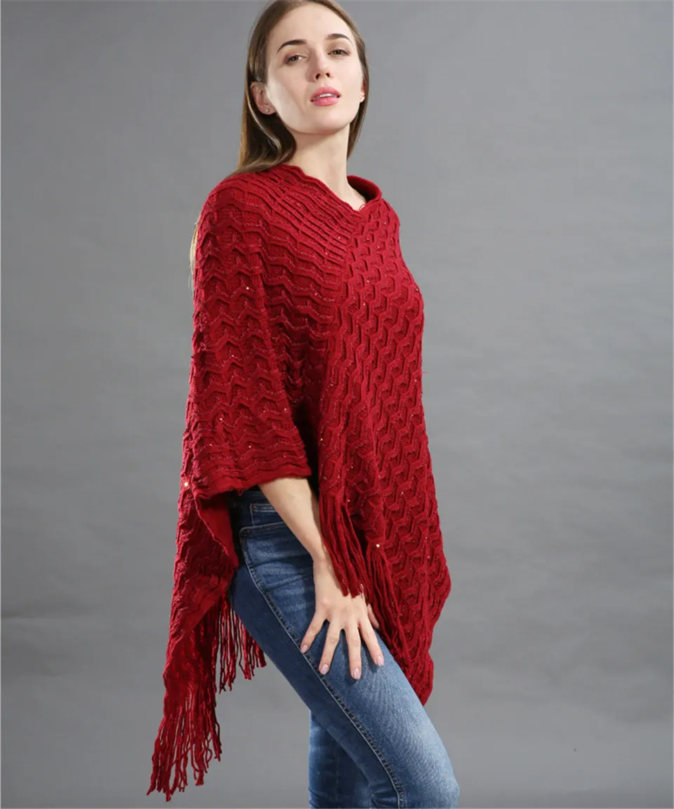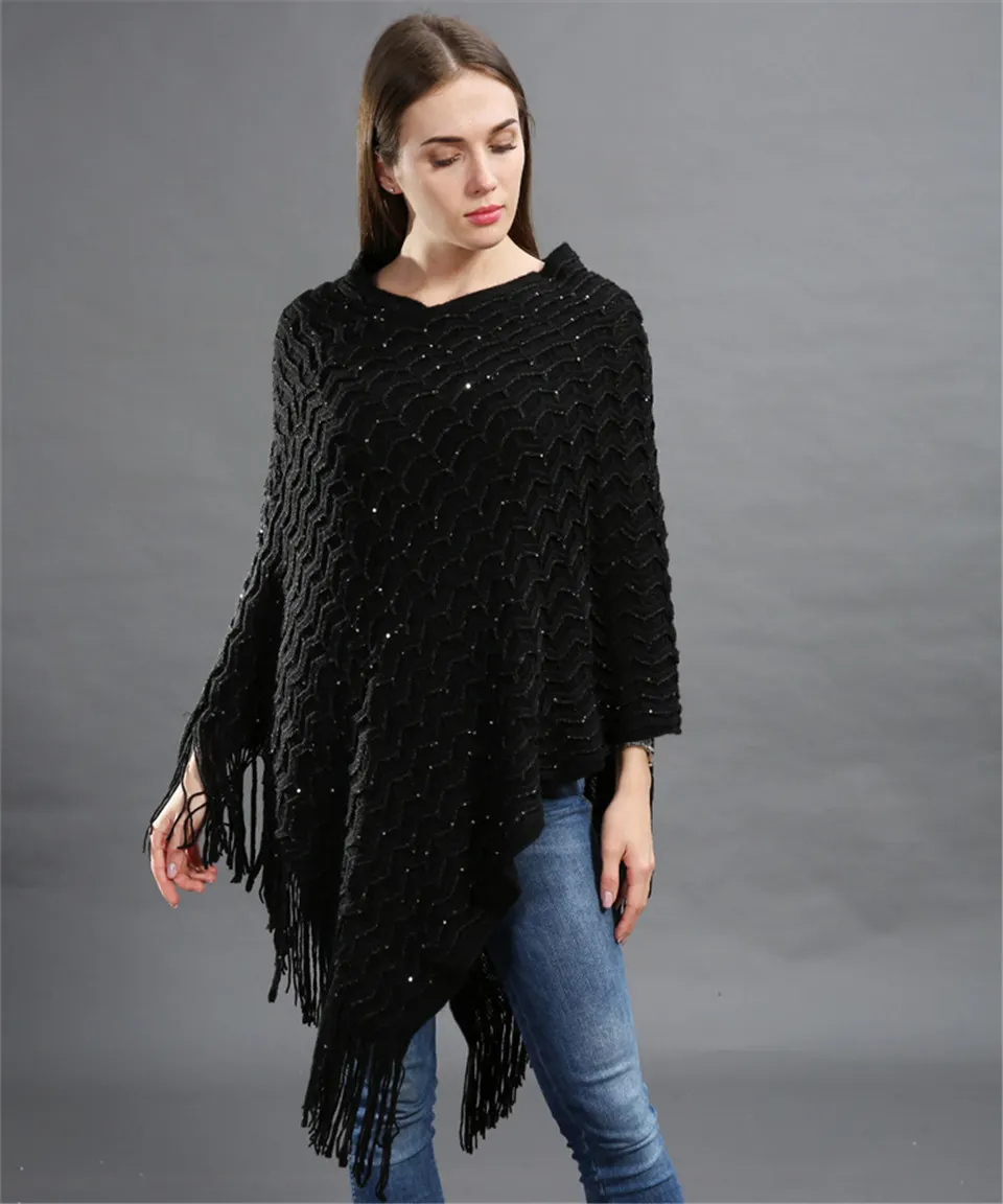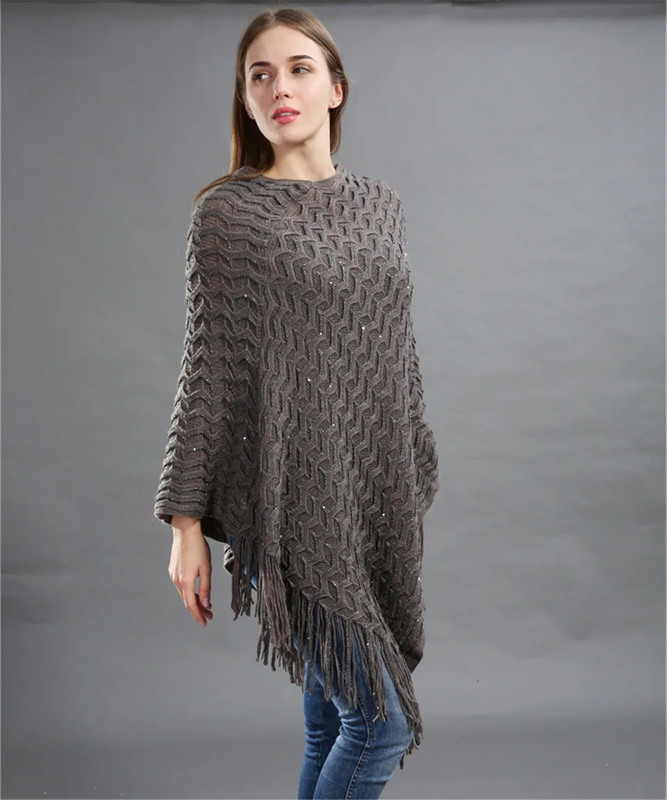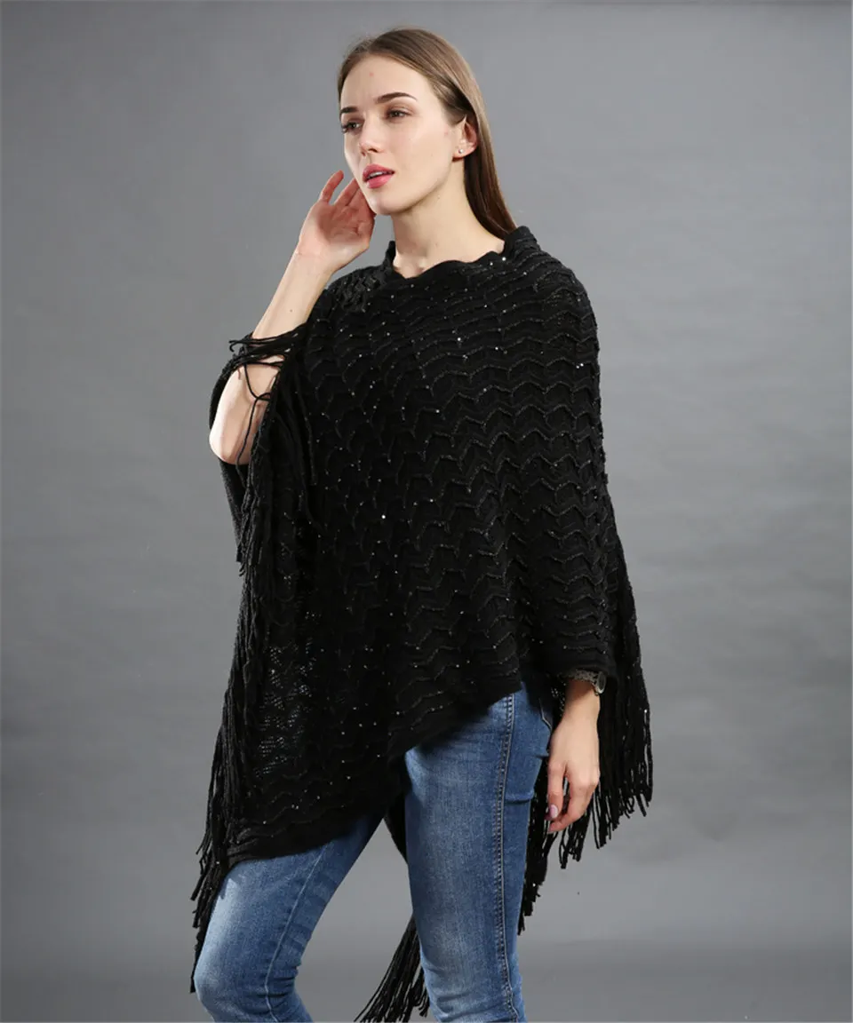 Warm Knitted Women Sweater Plus Size Solid Striped Sequins Poncho Winter Thick Tassel Sweater Batwing Sleeve Poncho And Capes