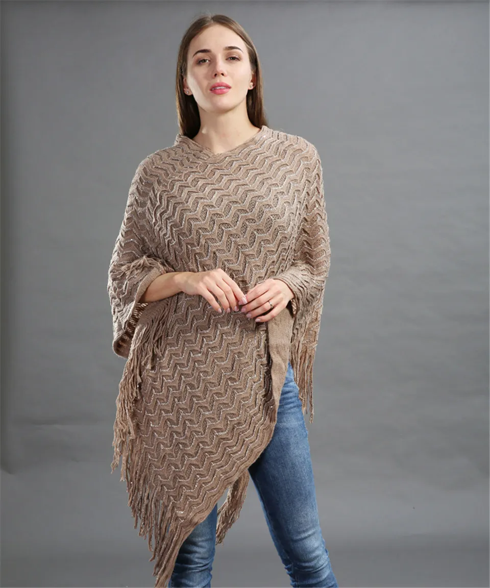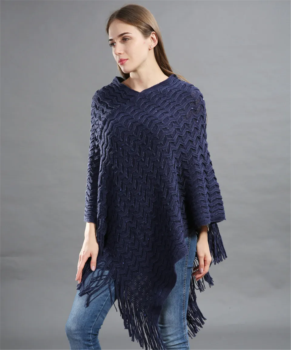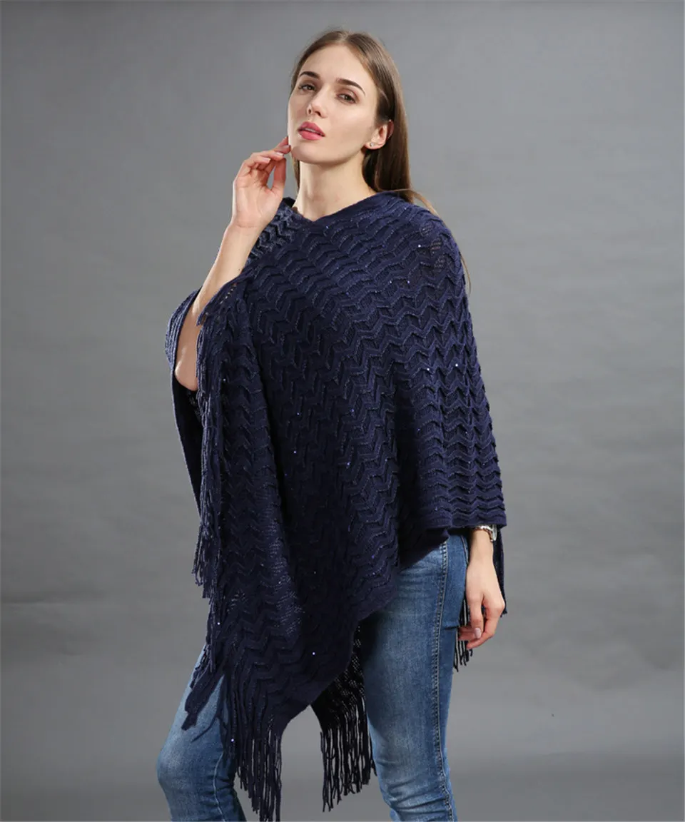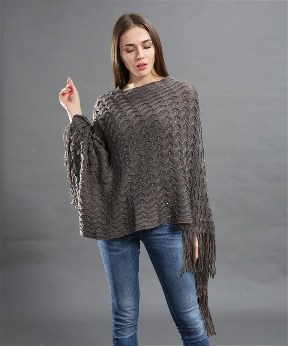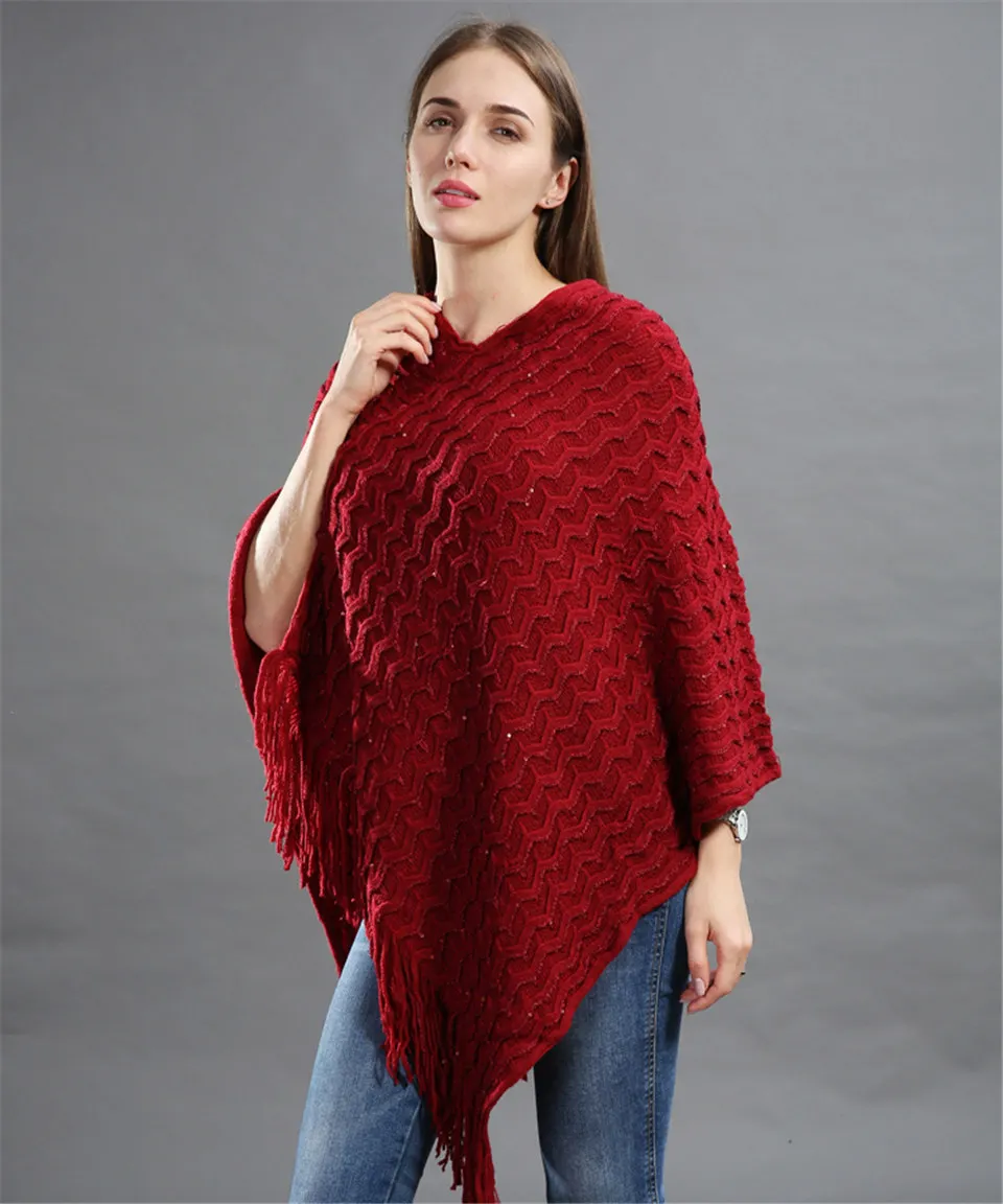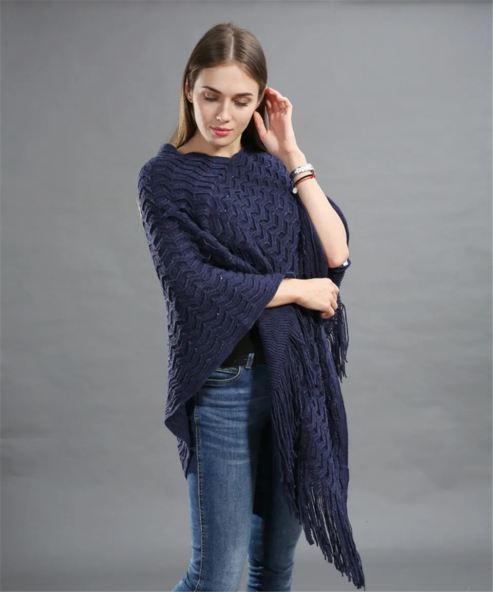 Warm Knitted Women Sweater Plus Size Solid Striped Sequins Poncho Winter Thick Tassel Sweater Batwing Sleeve Poncho And Capes