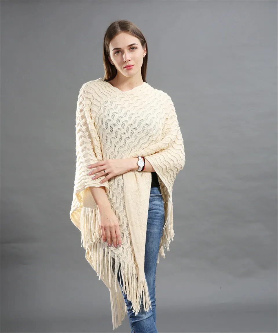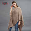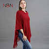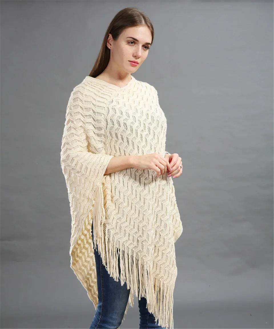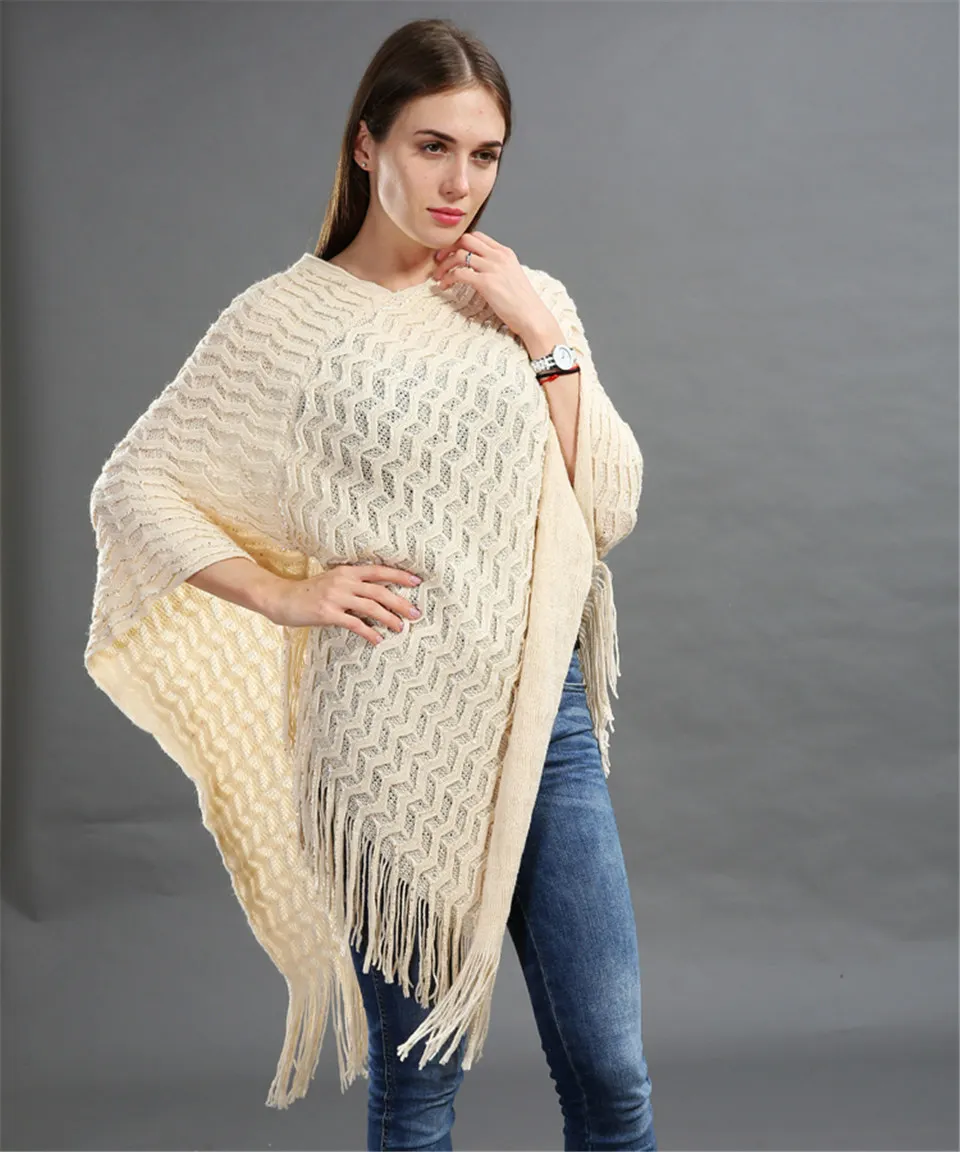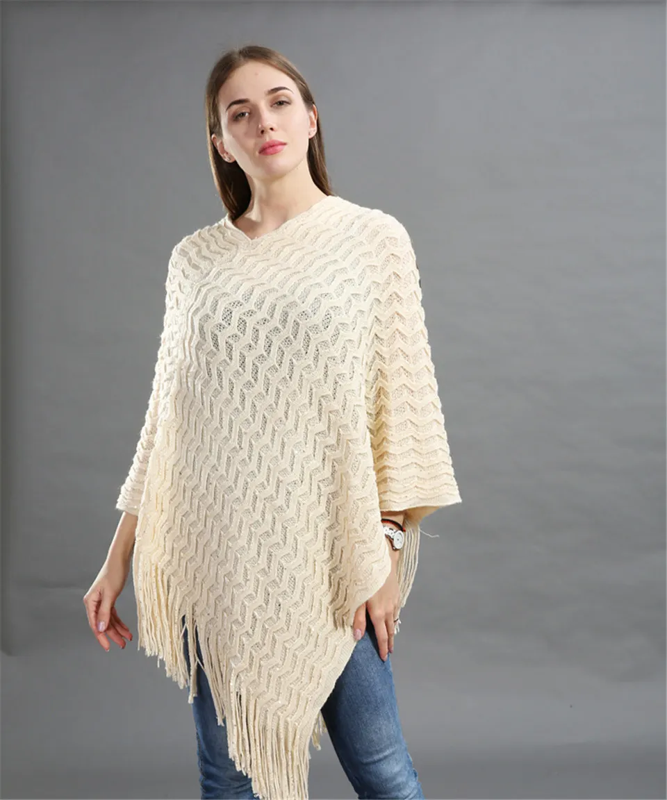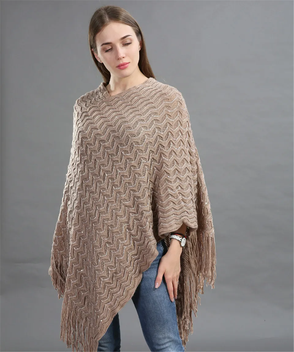 Warm Knitted Women Sweater Plus Size Solid Striped Sequins Poncho Winter Thick Tassel Sweater Batwing Sleeve Poncho And Capes