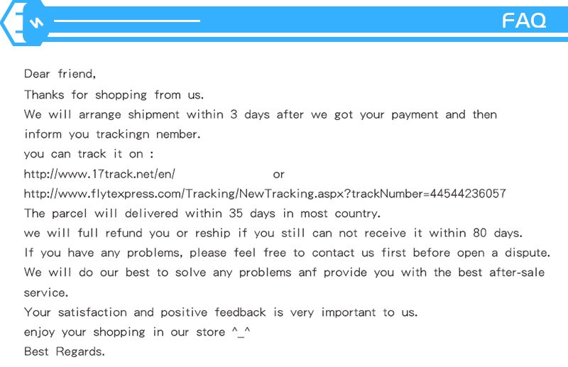 • If you did not receive the product within the guaranteed time( 45 days not including 2-5 day processing) you can request a refund or a reshipment.