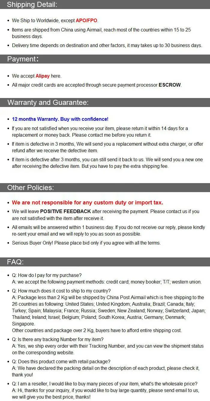 • If you did not receive the product within the guaranteed time( 45 days not including 2-5 day processing) you can request a refund or a reshipment.