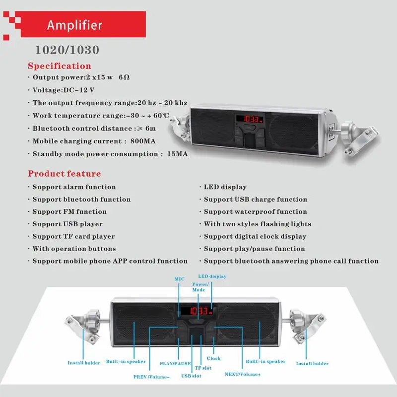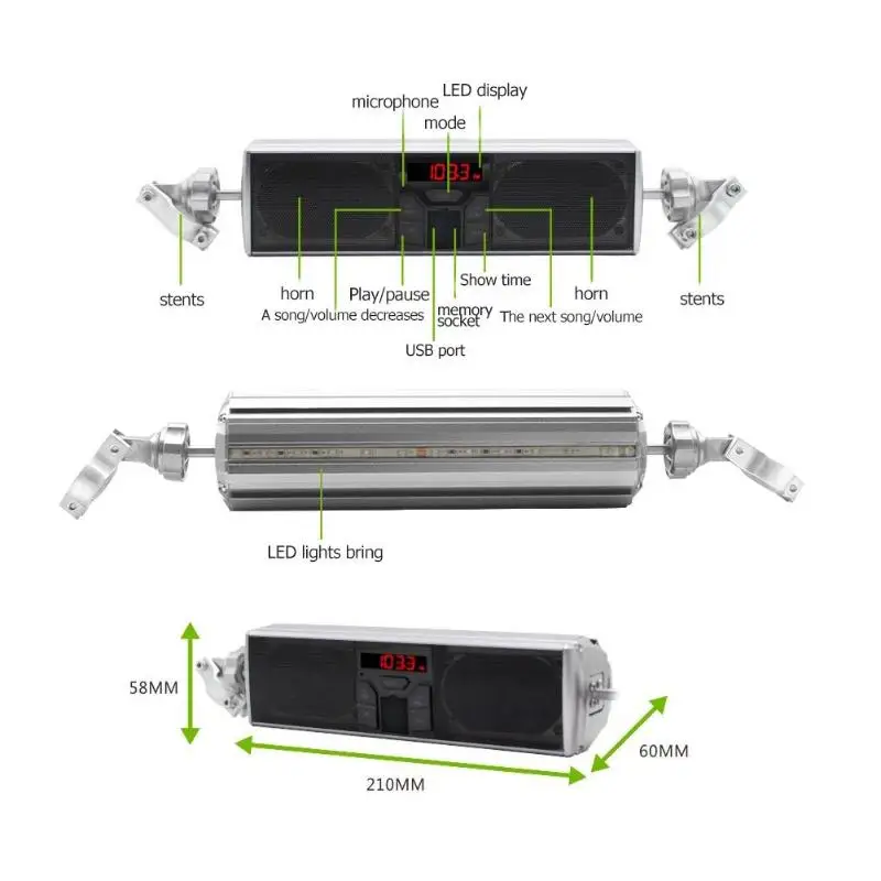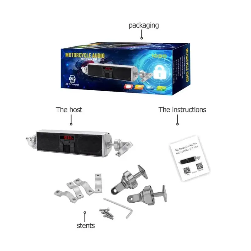 Features: – Bluetooth function – Support mobile APP software control – Support anti-theft function – Support waterproof function – Support USB playback, TF card playback, MP3 format, and radio function – Power off memory function – With LED display – Intergrated design – LED strip light design on the back Specifications: 1 x Motorcycle Bluetooth Audio Sound System