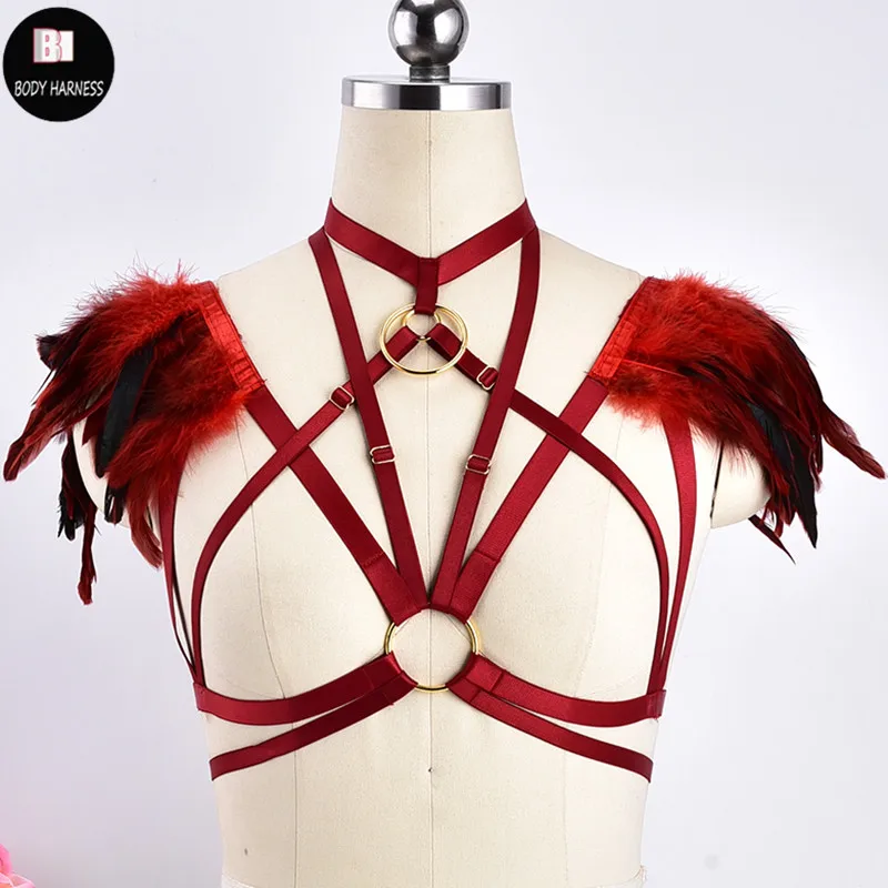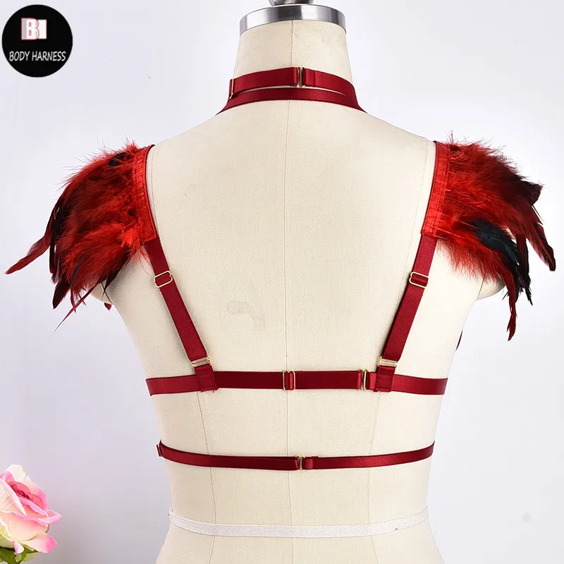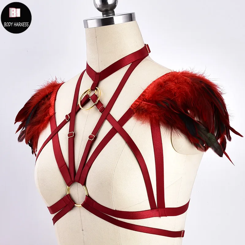Wedding Wings Feather Bra Sexy Body Harness Pastel Gothic Epaulettes Feather Dress Fetish Festival Rave Wear Crop Top Body Cage