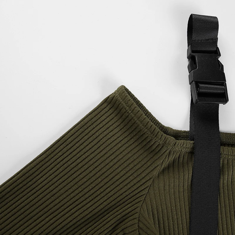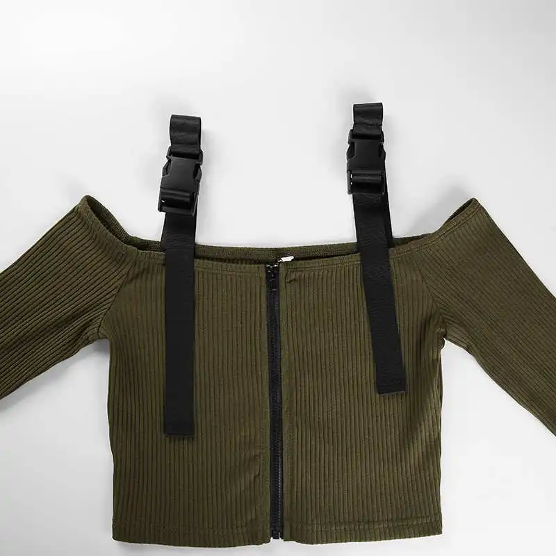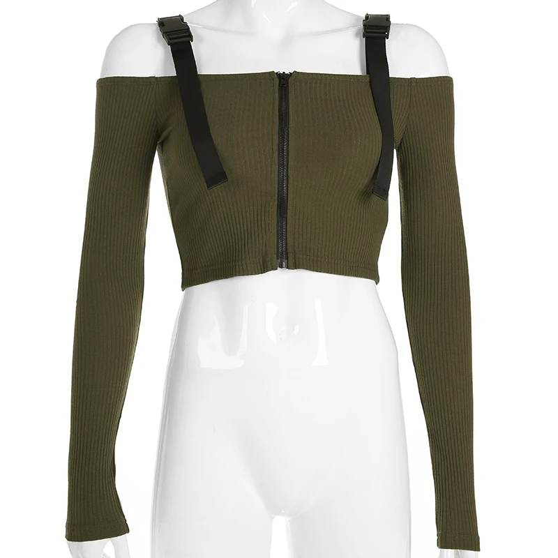 Weekeep Women Zipper Adjustable Strap t shirt Fashion Streetwear Long Sleeve Crop Top Sexy Cropped Slash Neck t-shirt Tops