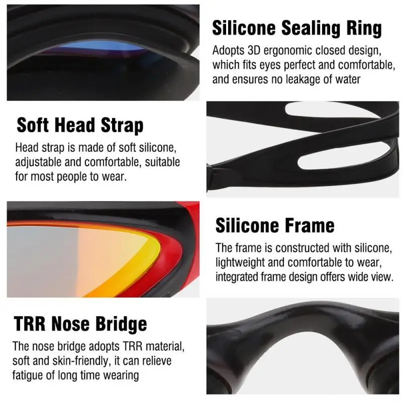 - The sealing ring on the lens use silicone and adopts 3D ergonomic closed design, which fits eyes perfect and comfortable, and ensures no leakage of water.