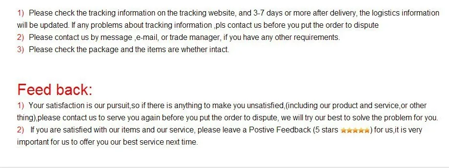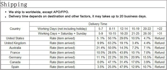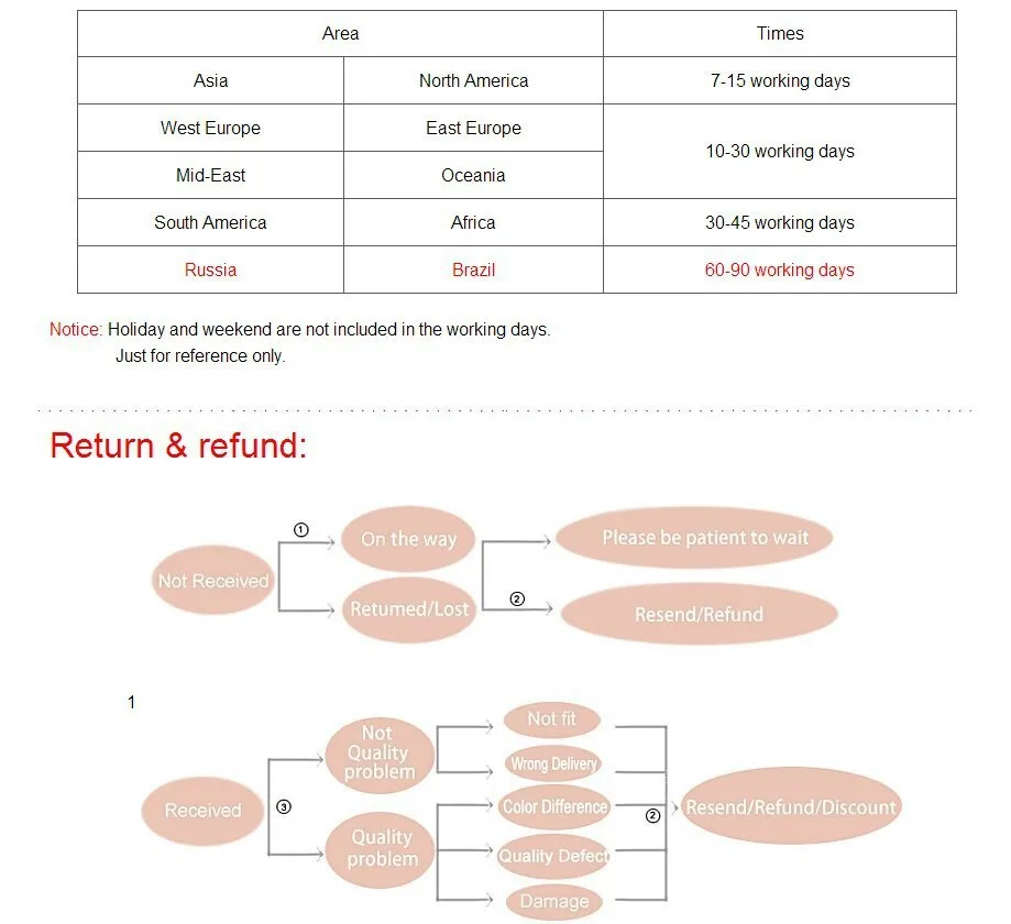 • If you did not receive the product within the guaranteed time( 45 days not including 2-5 day processing) you can request a refund or a reshipment.