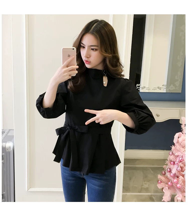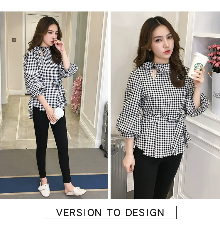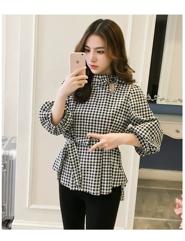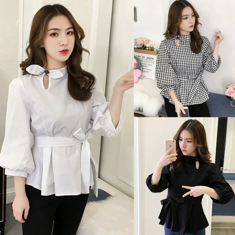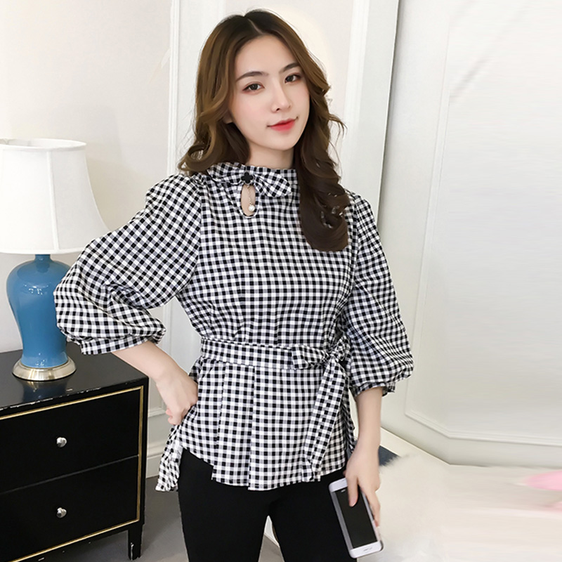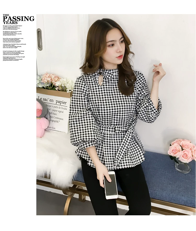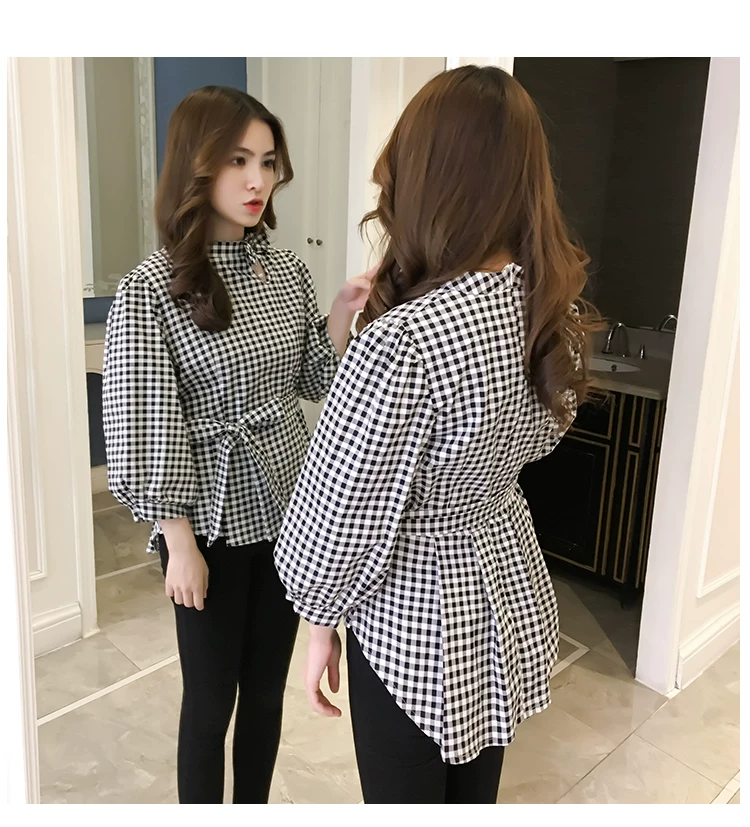 Product Name :White Shirt Women Peplum TopFashion 2018 Summer Lantern Sleeve Tops For Women 2018 Streetwear Black Plaid Women Blouse With Bow