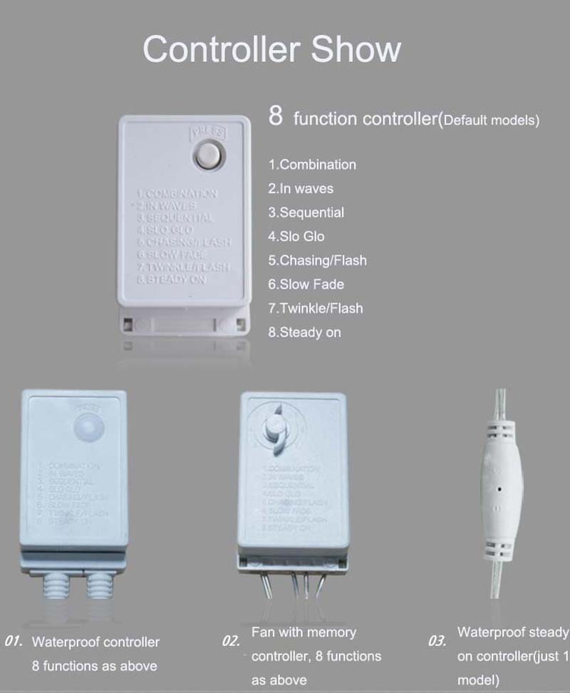 - Operation mode: Combination,In waves,Sequential,Slo Glo,Chasing/Flash,Slow Fade,Twinkle/Flash,Steady on.