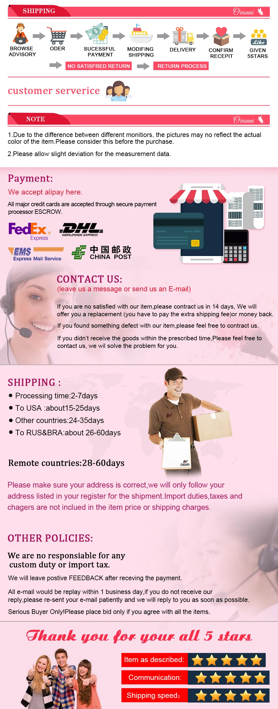 • If you did not receive the product within the guaranteed time( 45 days not including 2-5 day processing) you can request a refund or a reshipment.