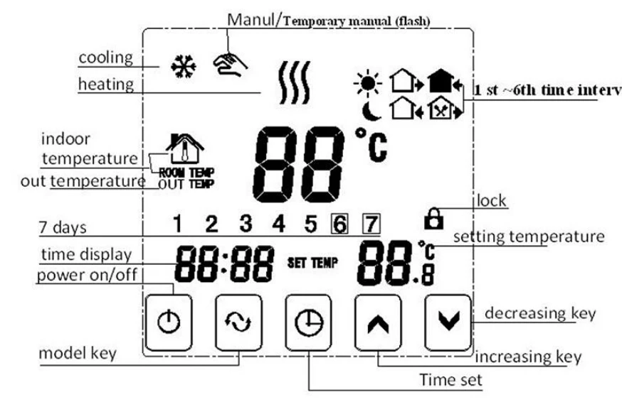 Weekly programmable:7 days programmable and 6 period programmable per day