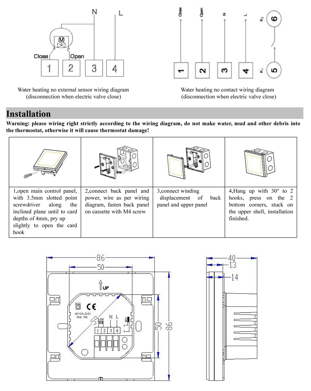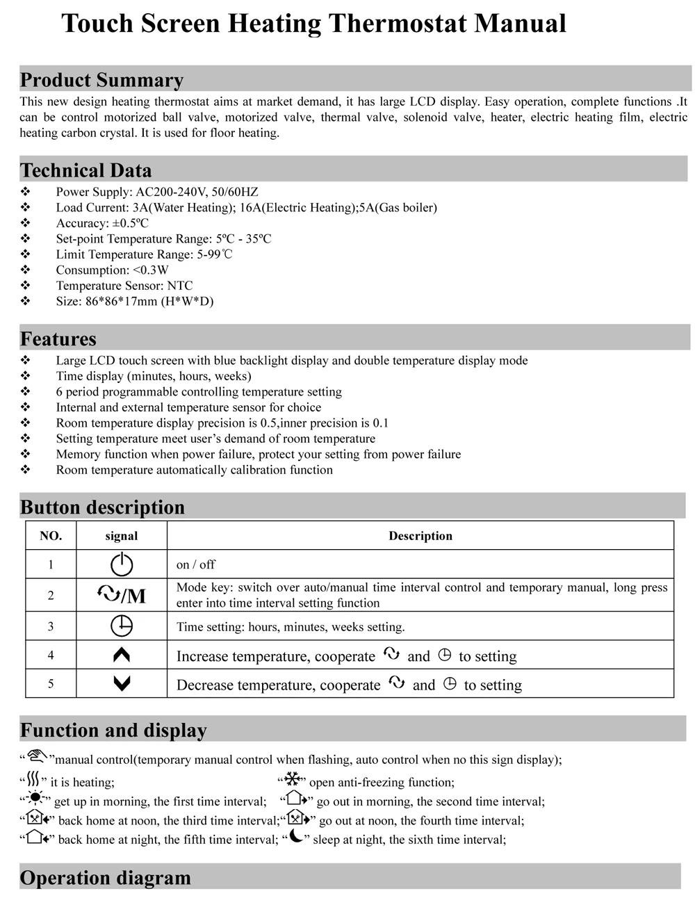 HY03 series thermostat is a touch screen programmable thermostat designed for electric floor heating, infrared radiator heater panel heating and carbon crystal wall heating.It helps to limit room temperature.This thermostat can be used for room electric heating systems. Models are with NTC sensor to detect ambient and floor temperature and do the control by compared with the setting one.