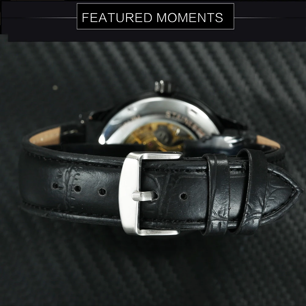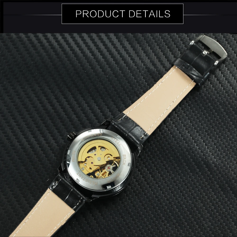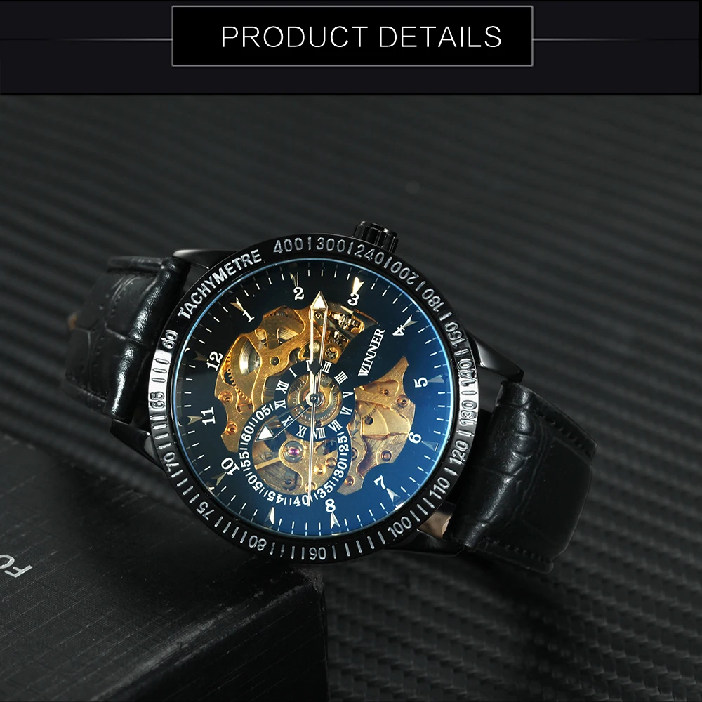 WINNER Automatic Mechanical Mens Watches Top Brand Luxury Skeleton Golden Dial Anti-reflective Coating Case Leather Wrist Watch