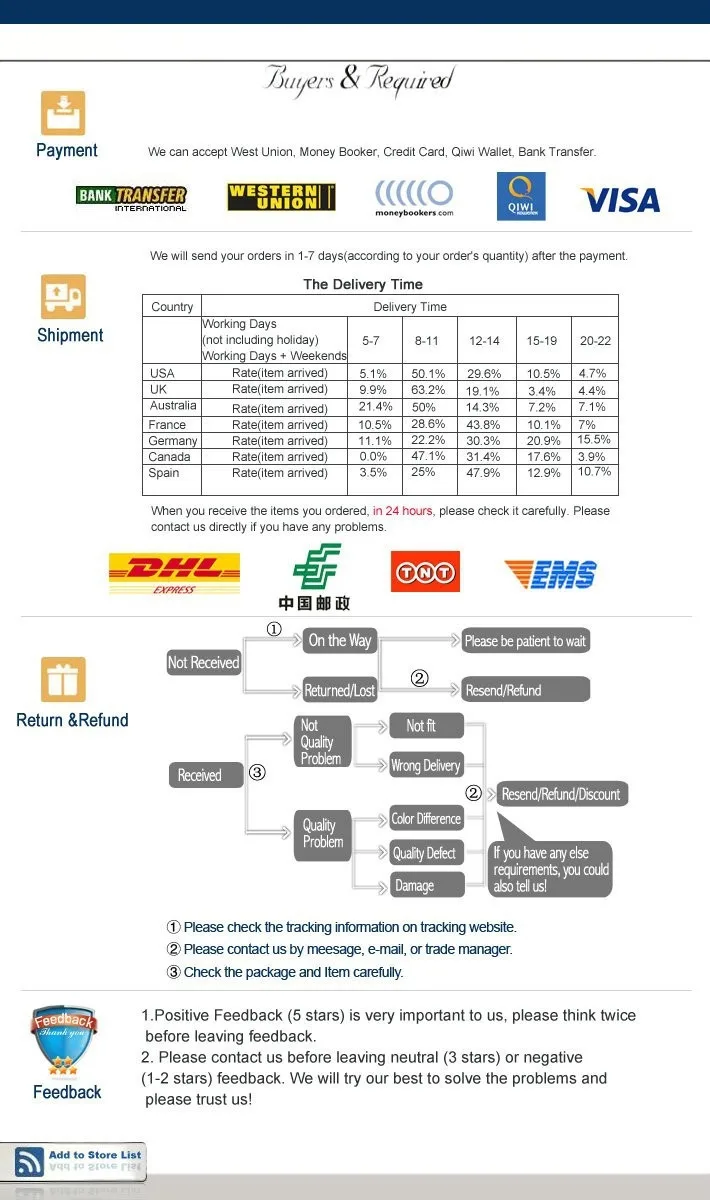 • If you did not receive the product within the guaranteed time( 45 days not including 2-5 day processing) you can request a refund or a reshipment.