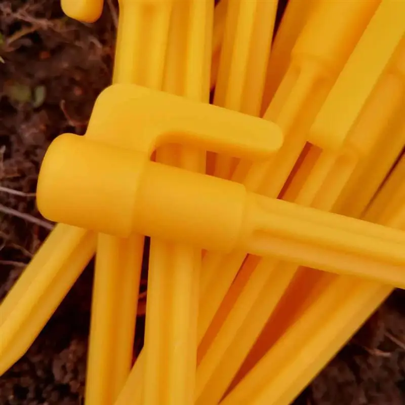 Plastic stakes in a safety yellow color to hold your outdoor blanket or a tent. Each stake has an anchor to safely pin down anything which needs to be safe against the wind. They provide serious holding power and are unbelievably lightweight. Rustproof plastic, durable and resuable.