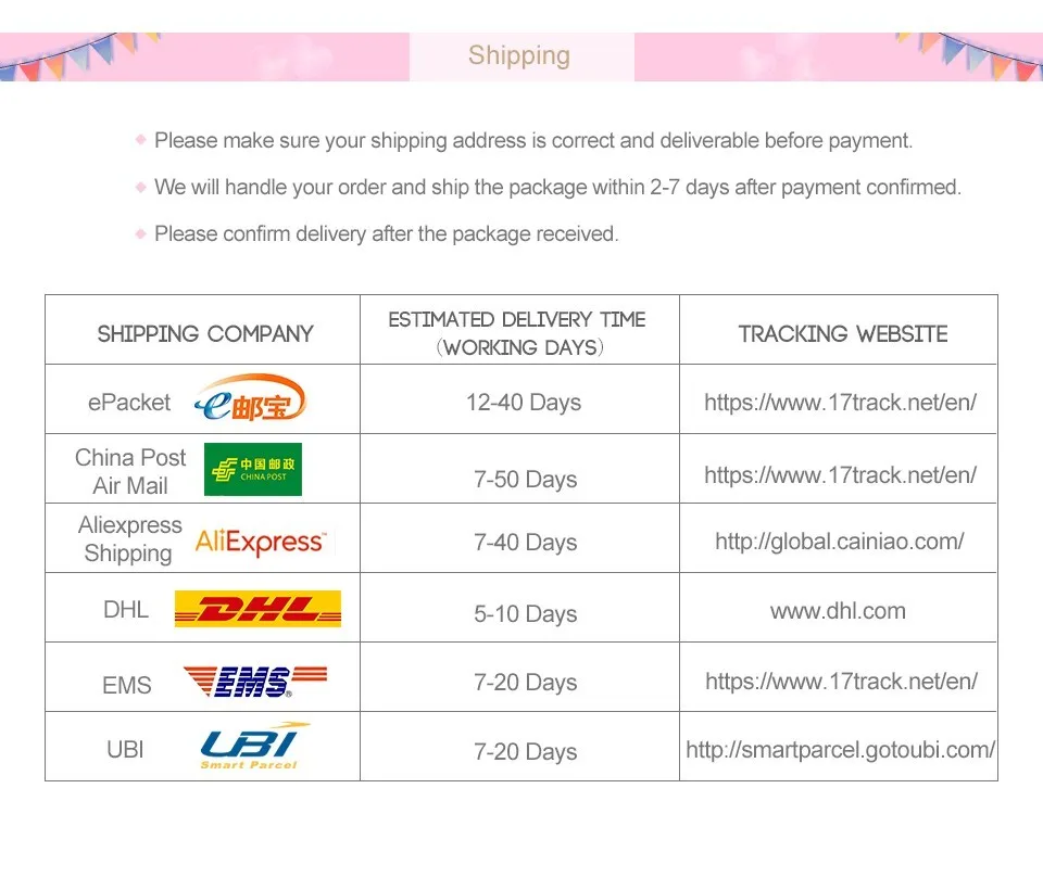 Packages from our warehouse in China will be shipped by ePacket or EMS depending on the weight and size of the product. Packages shipped from our US warehouse are shipped through USPS.