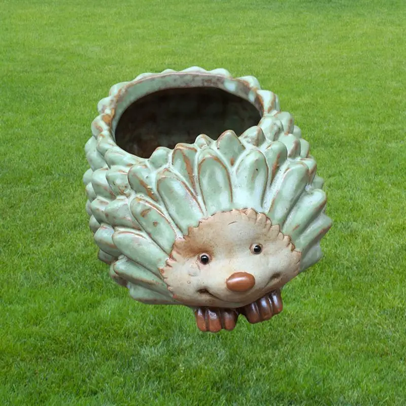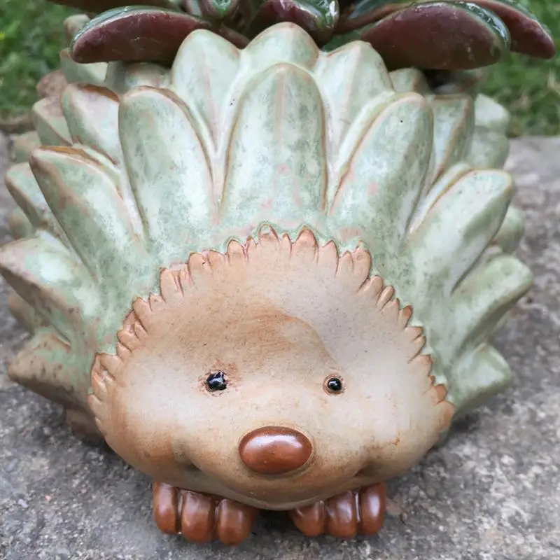This item is a resin flower pot in the shape of cartoon animal. It is strong, odorless and drop resistant. The Hedgehog looks very happy, huddling up and looking at its front prudently and the big hole is in the center of its back. Vivid facial expression makes it a good decoration suitable for home and office.
