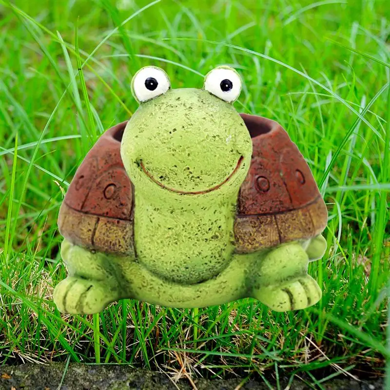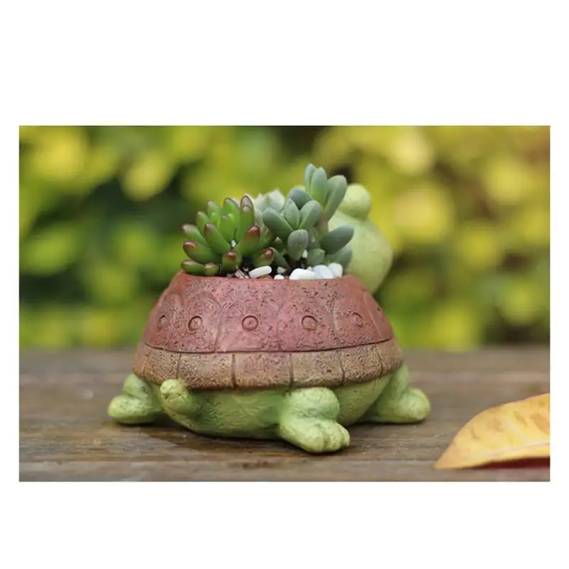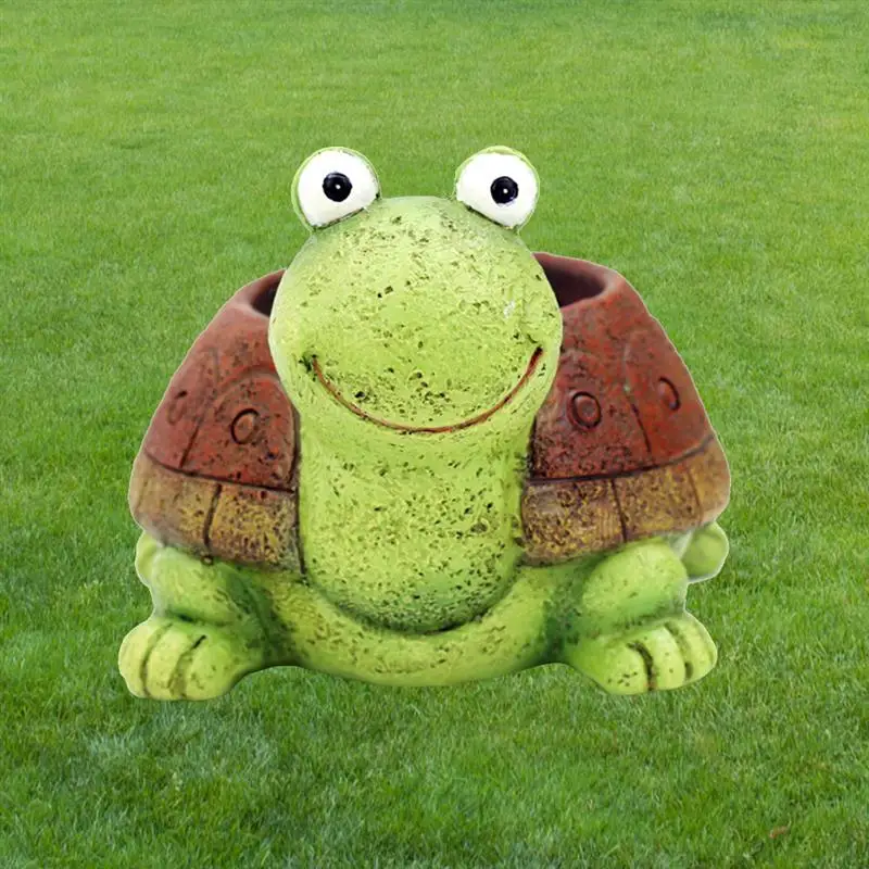 This item is a resin flower pot in the shape of cartoon animal. It is strong, odorless and drop resistant. The turtle looks funny, laying on its stomach and eyes aiming at front. Vivid facial expression makes it a good decoration suitable for home and office.
