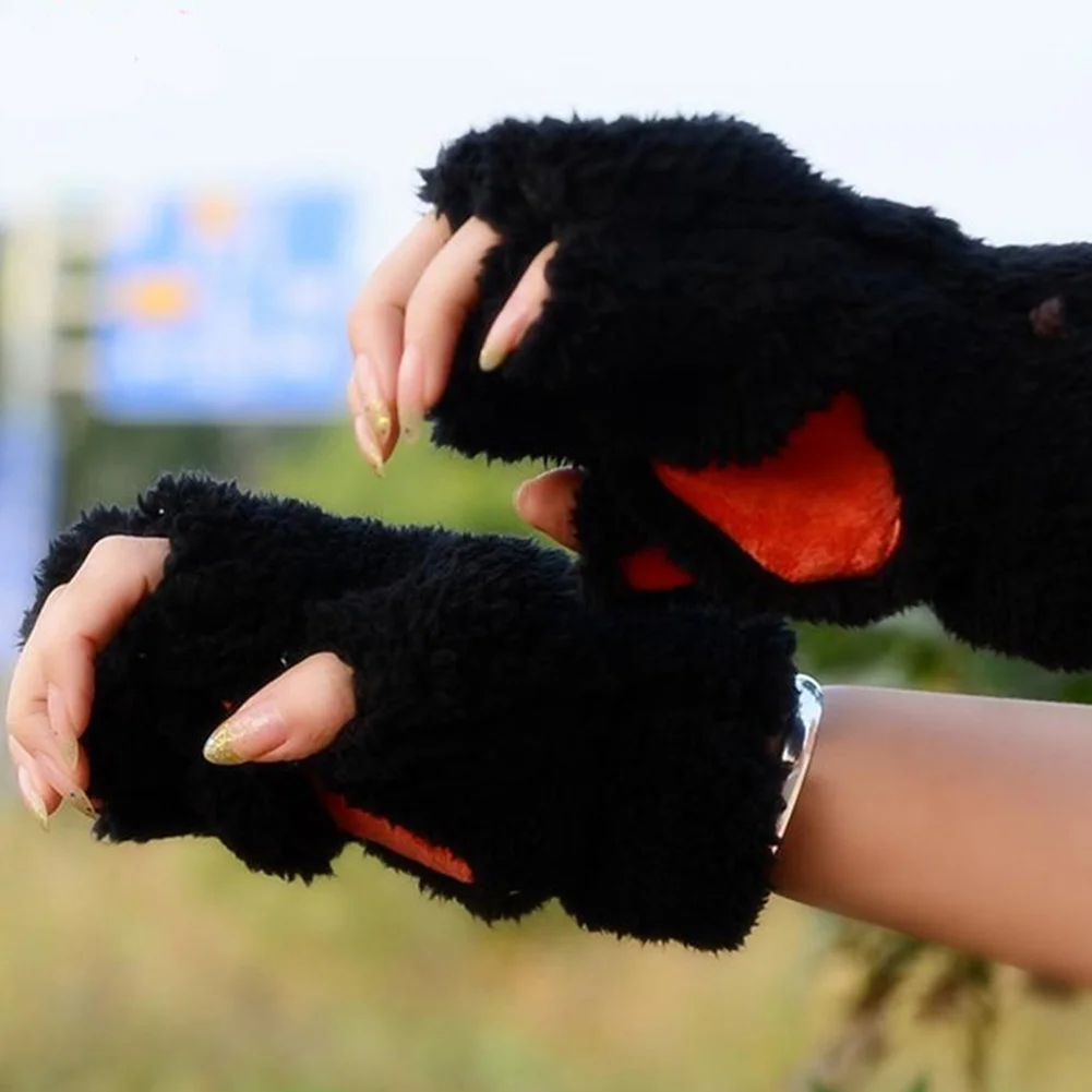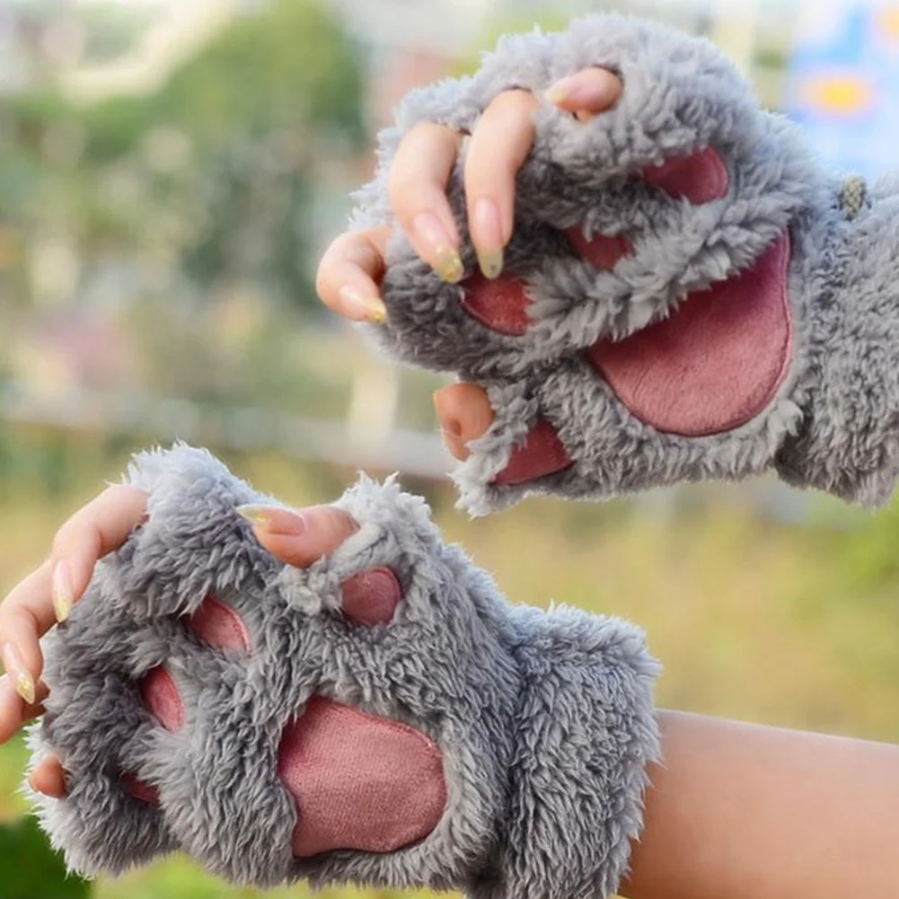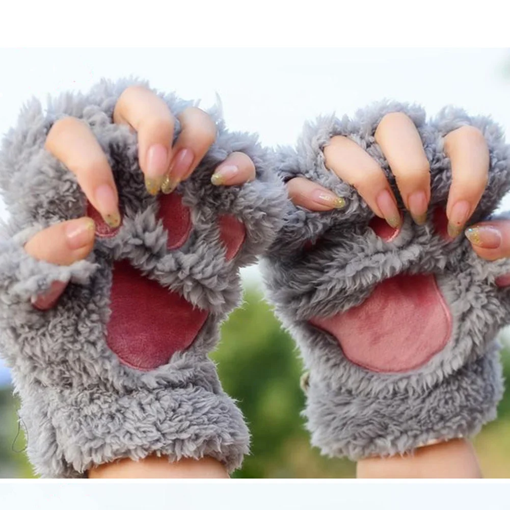 Winter New Fingerless Gloves Fluffy Bear Cat Plush Paw Claw Half Finger Glove Soft Half Covered Women Female Gloves Mittens