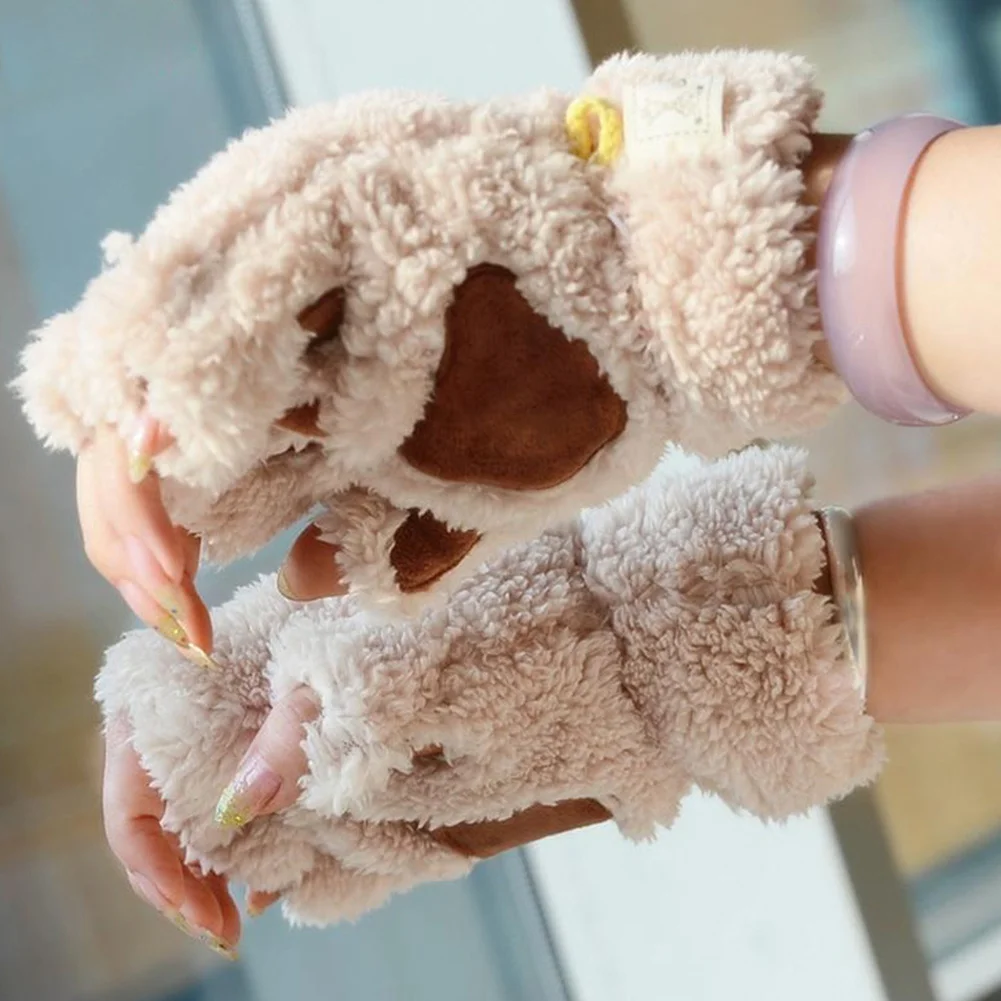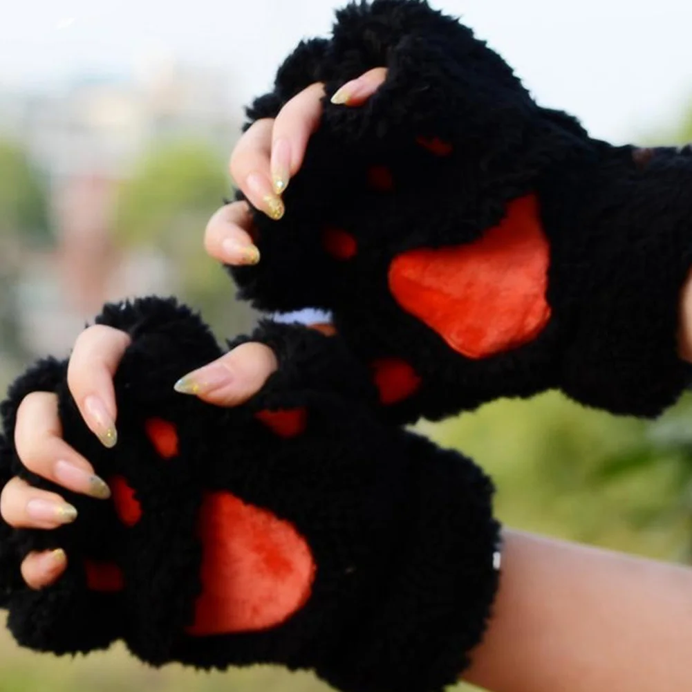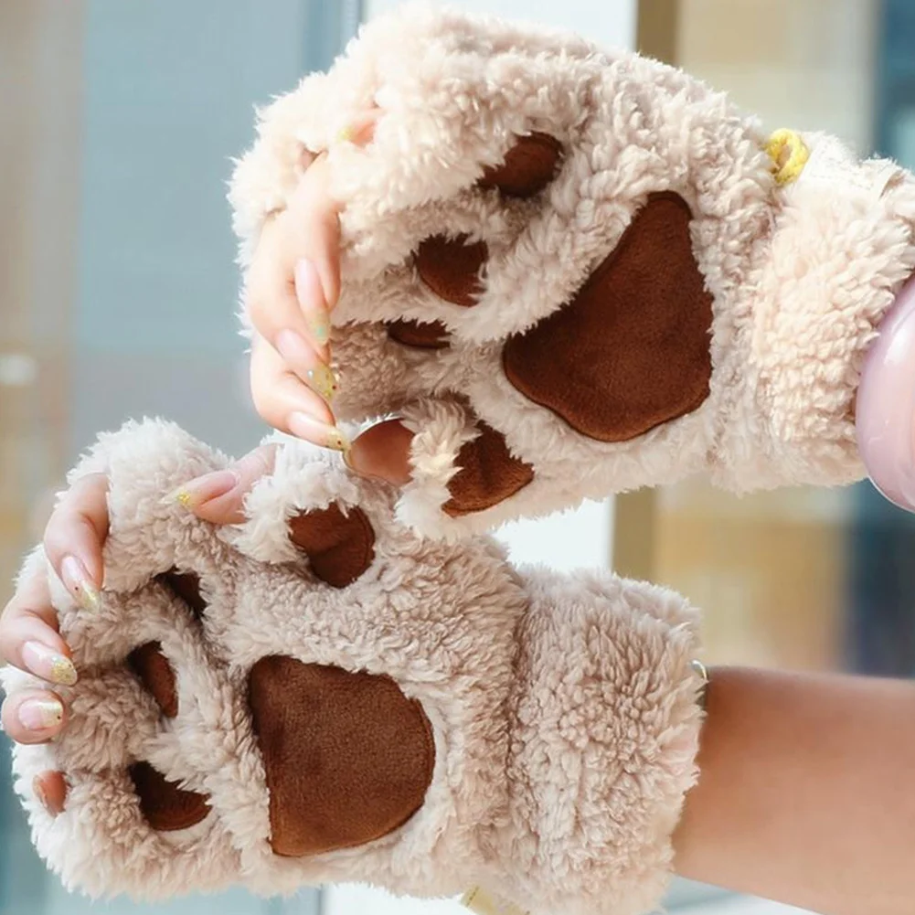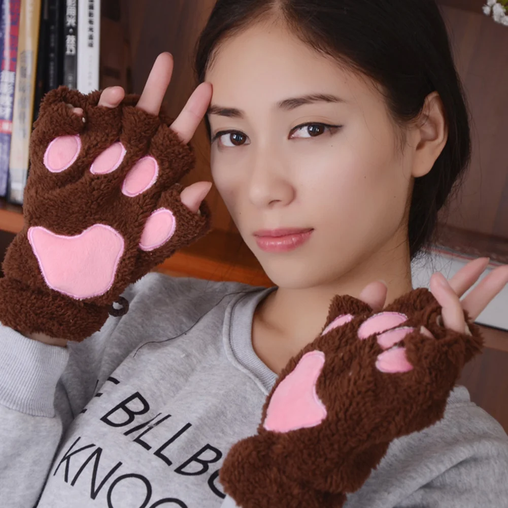 Winter New Fingerless Gloves Fluffy Bear Cat Plush Paw Claw Half Finger Glove Soft Half Covered Women Female Gloves Mittens