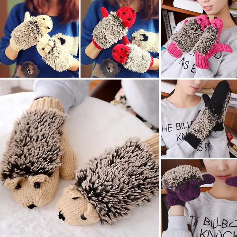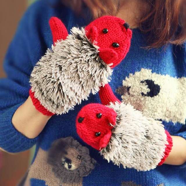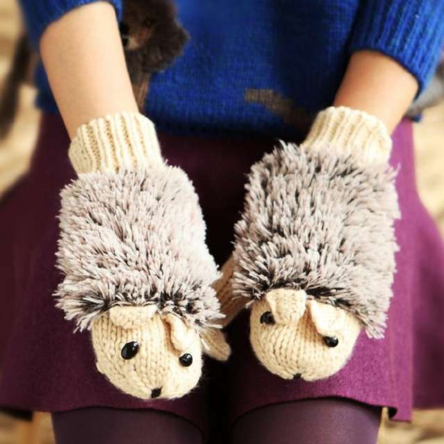 Winter Warm Cartoon hedgehog gloves women cute knit Female cotton white Mittens guantes mujer luvas feminina luva