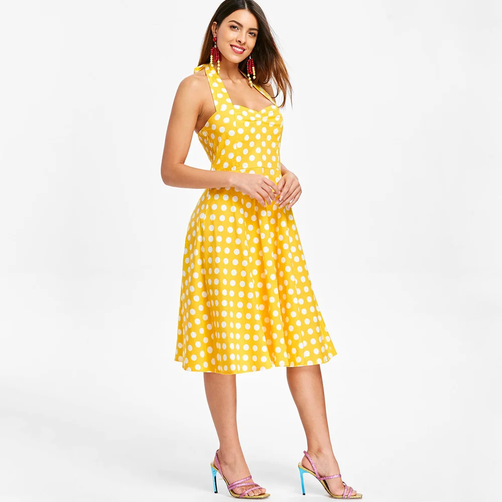 “*Vintage halter yellow dot print plus European royal style gives you a retro and elegant look; fit&flare silhouette flatters your figure