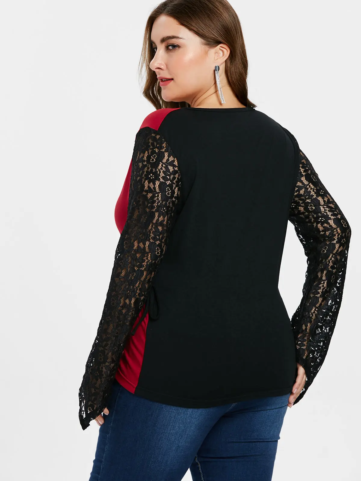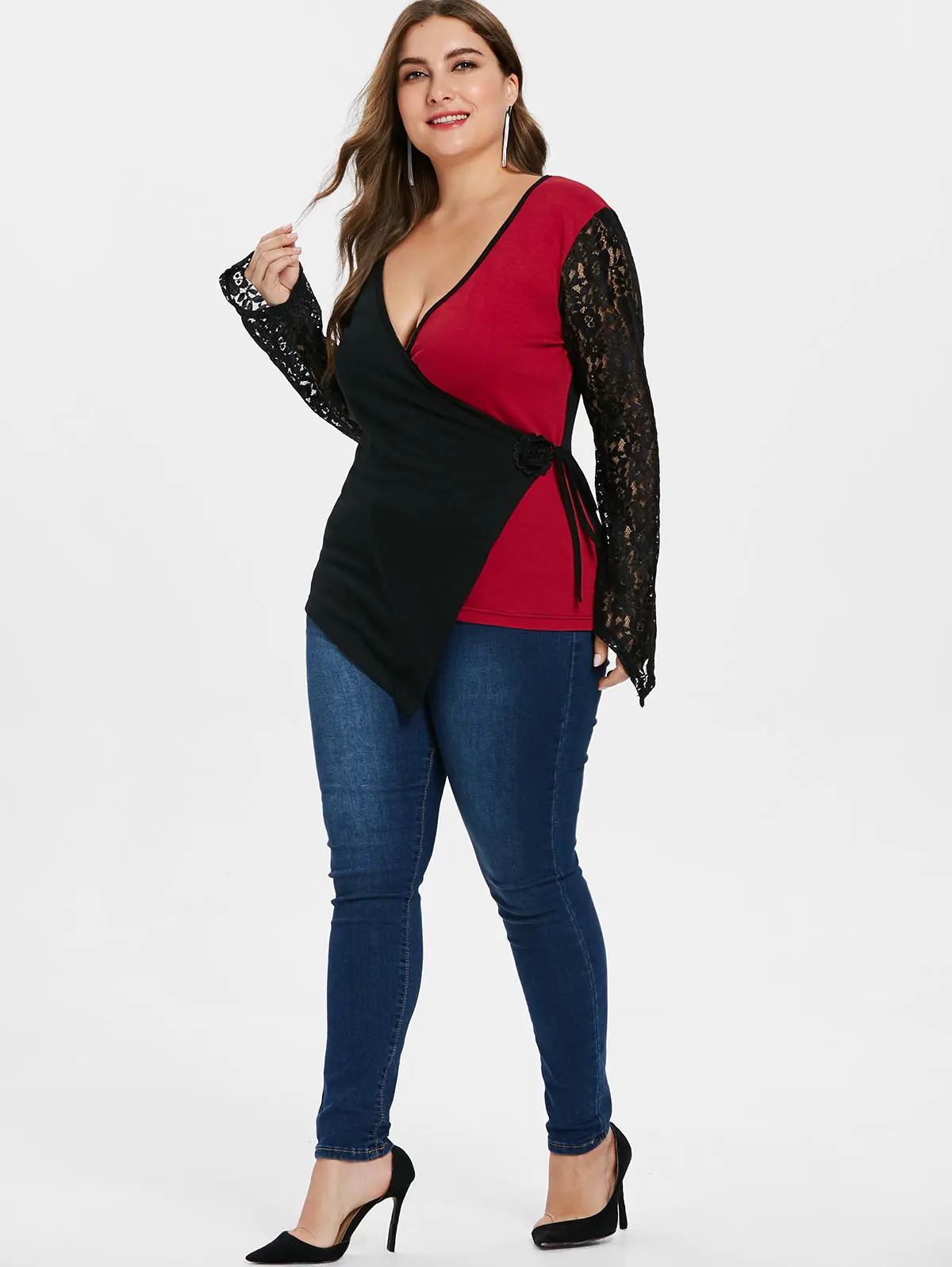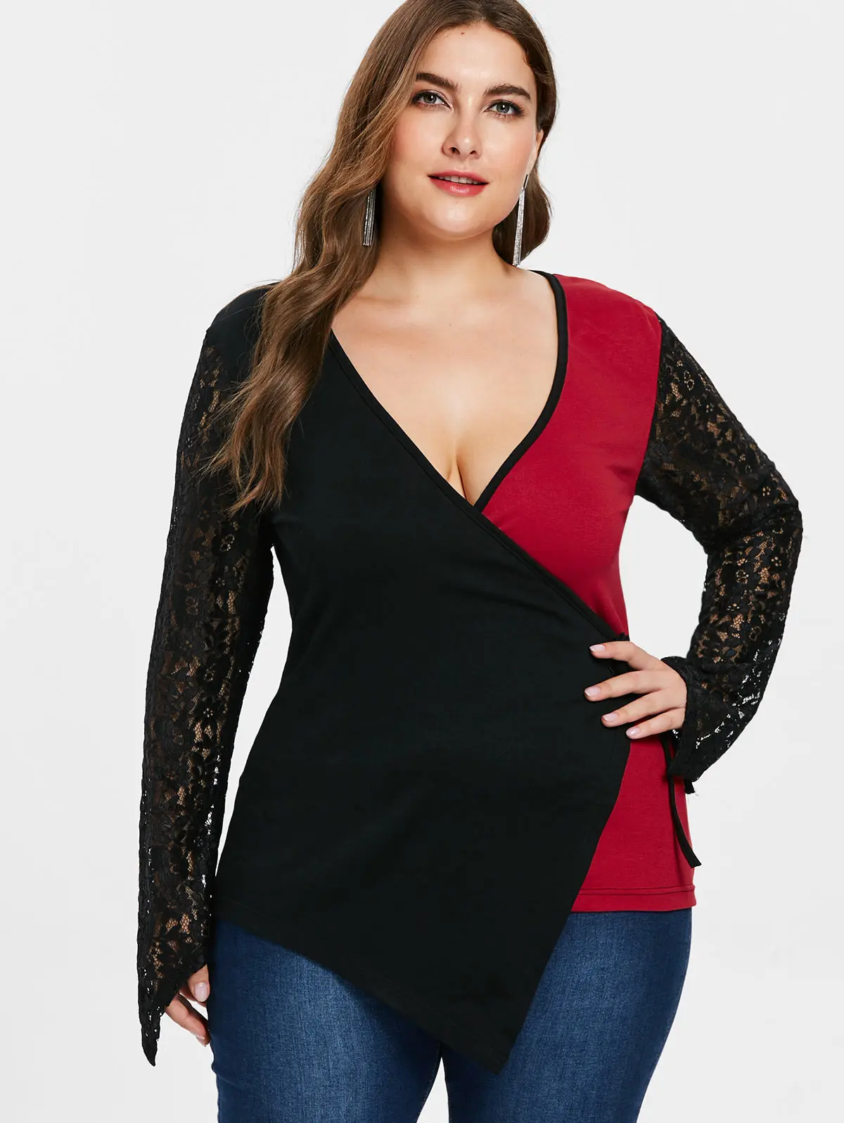 Wipalo Plus Size Lace Panel Sleeve Black And Red Two Tone Patchwork T-Shirt Casual Plunging Neck Asymmetric Hem Top Big Size 4XL