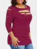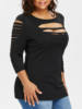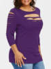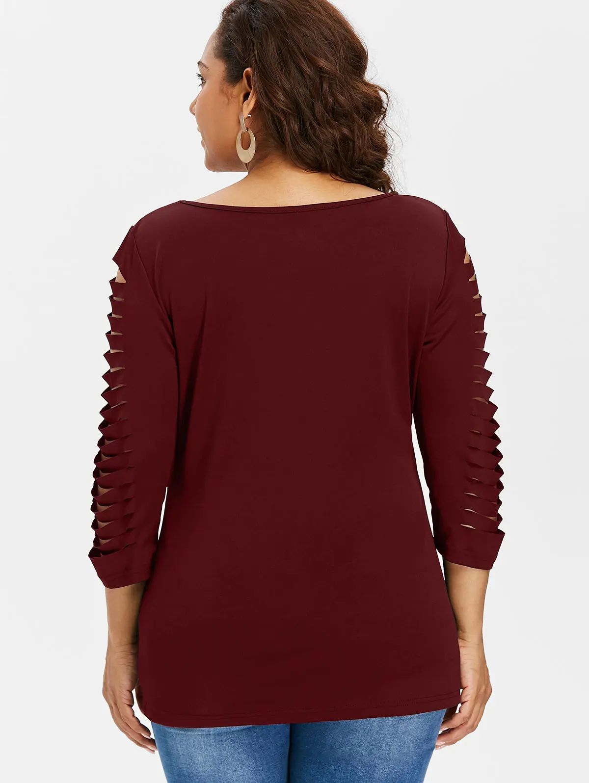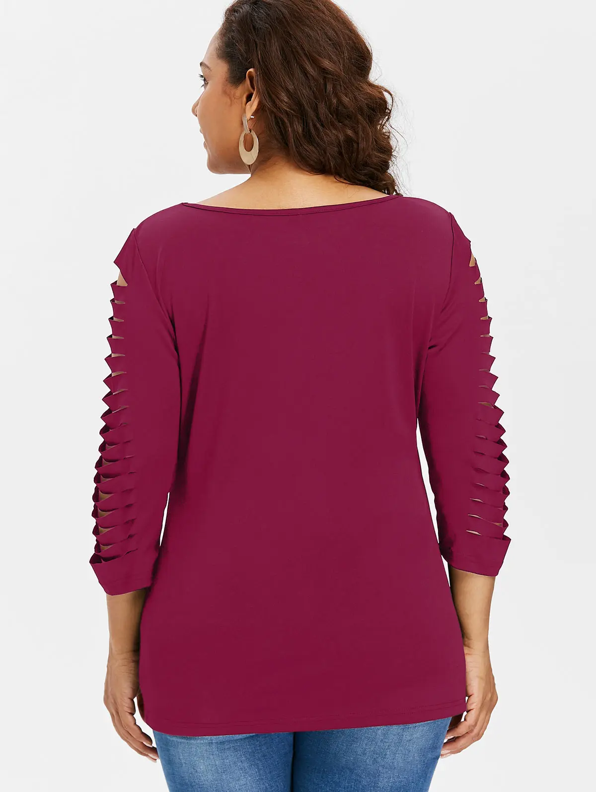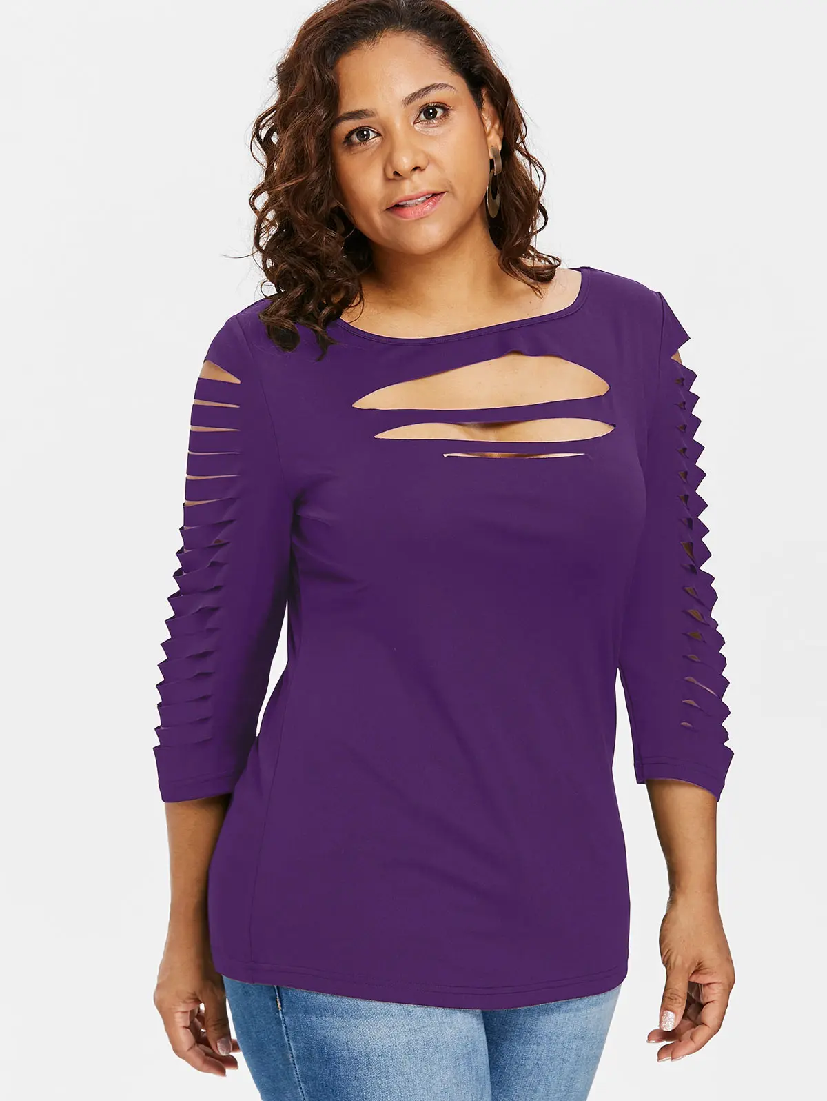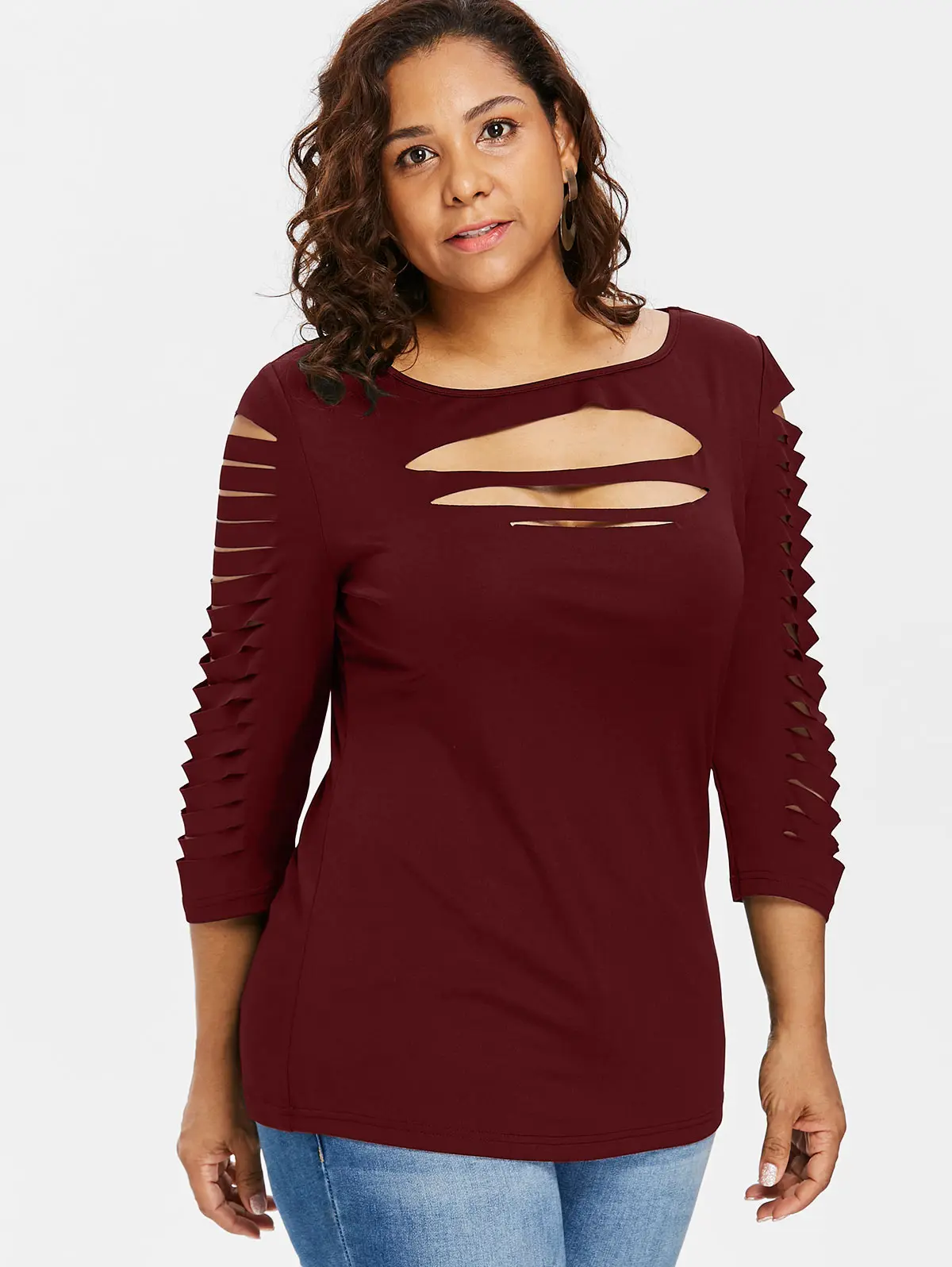 Wipalo Plus Size Ladder Keyhole Cut Front Ripped T-Shirt Women T Shirt Three Quarter Sleeve O Neck Casual Ladies Tops 5XL