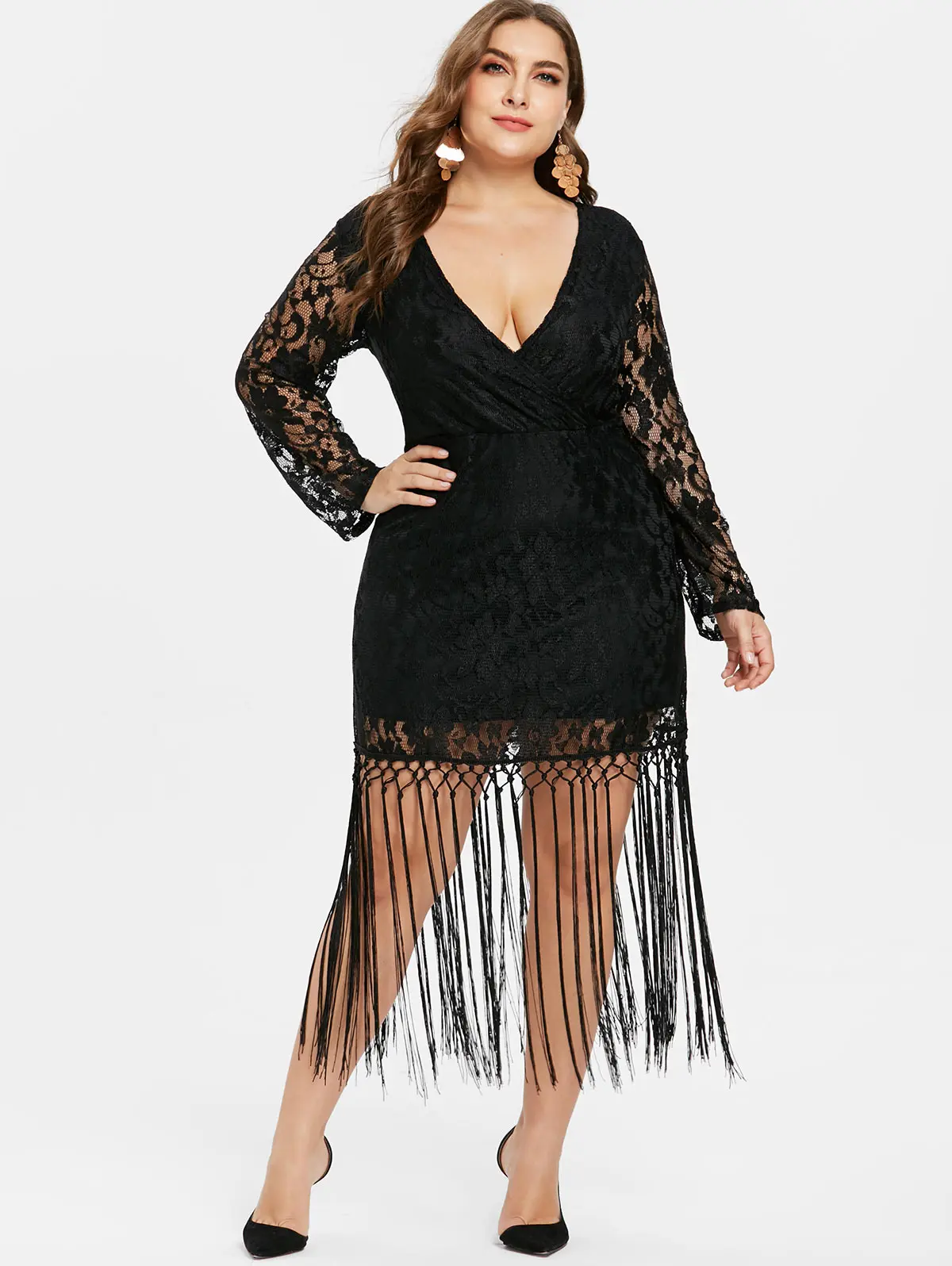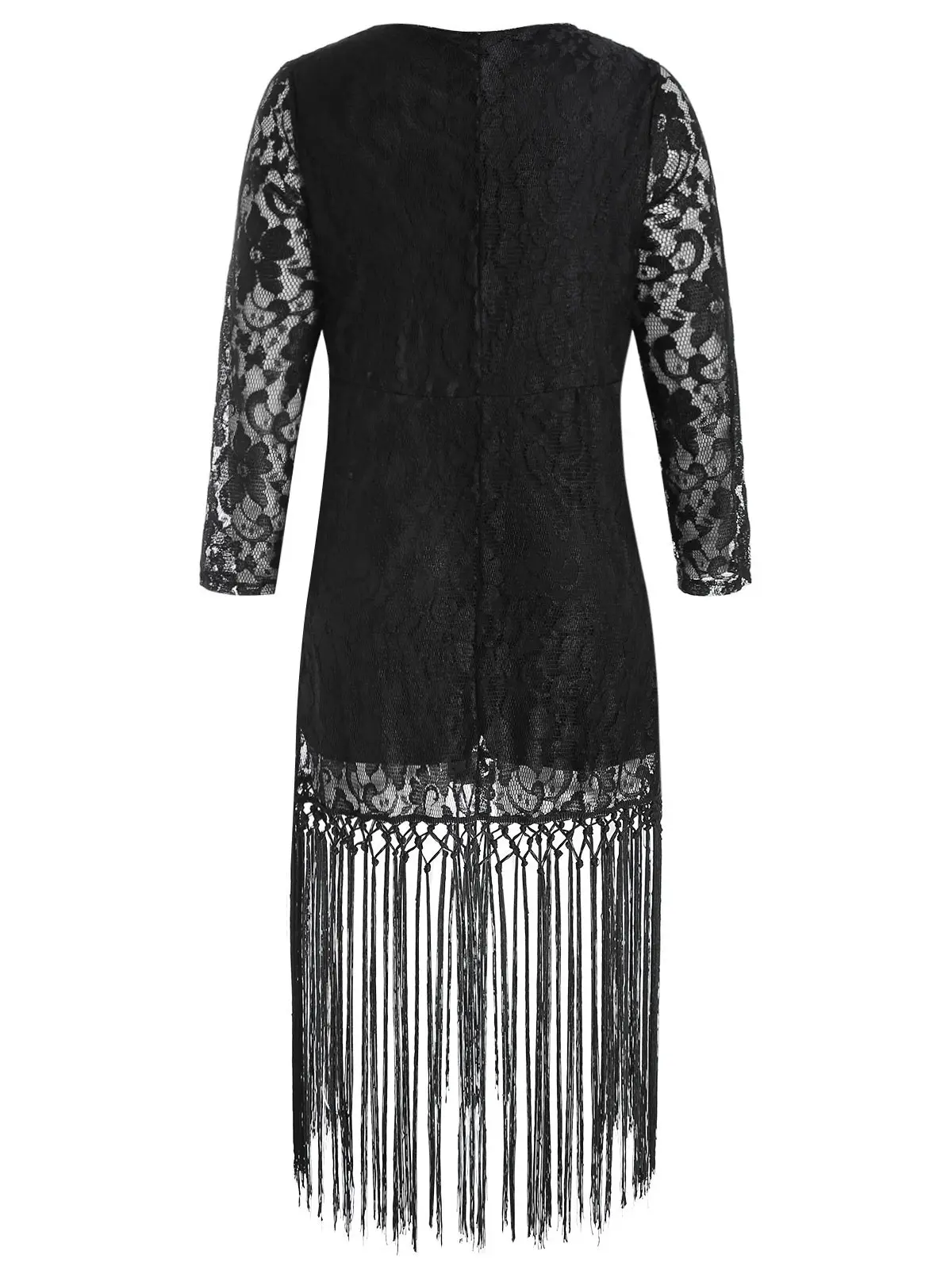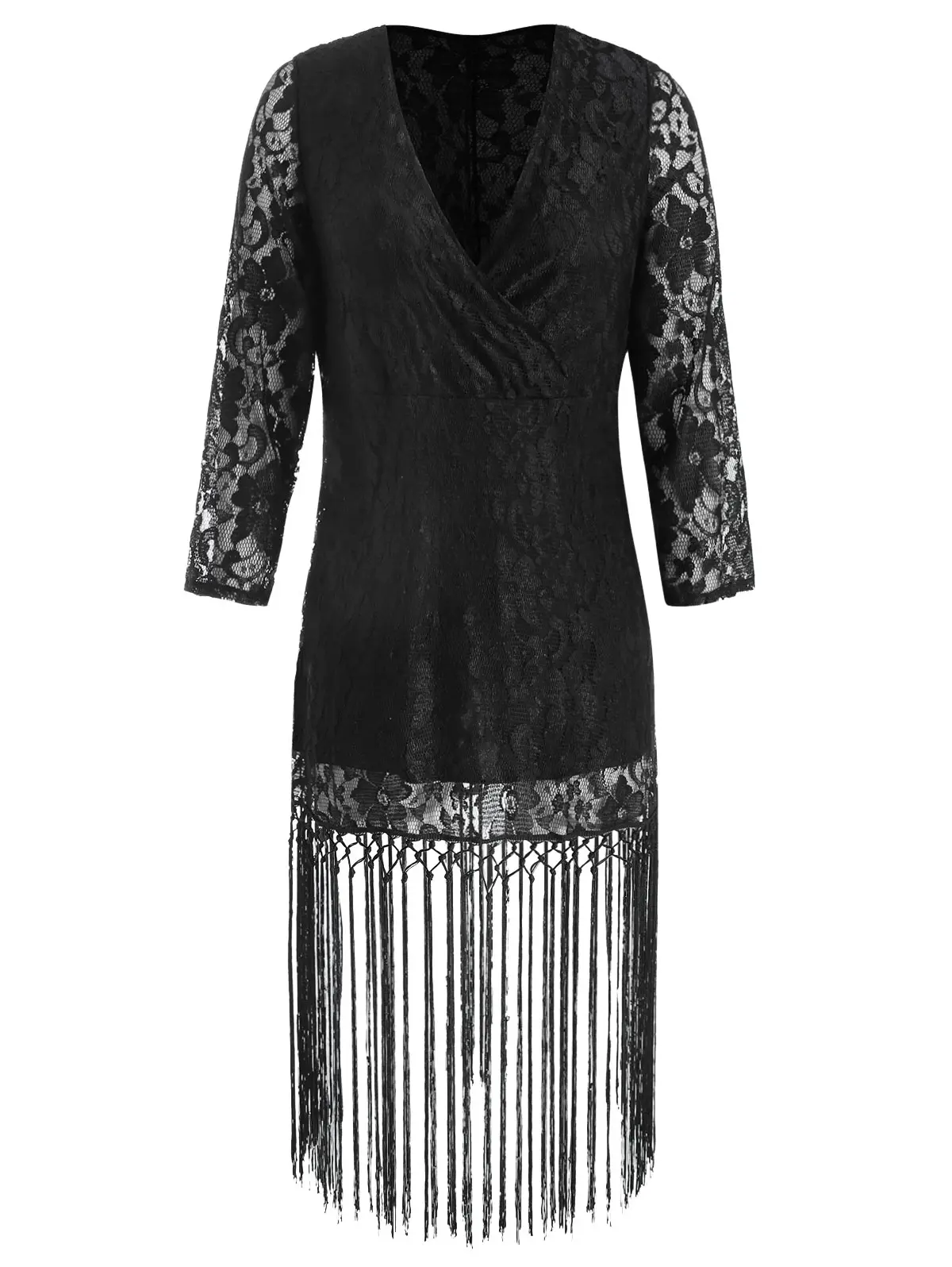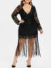 Wipalo Plus Size Long Sleeve Deep V Neck Lace Tassel Dress Sexy Lace Crochet Tassel Black Party Mid-Calf Dress Vestidos 3XL