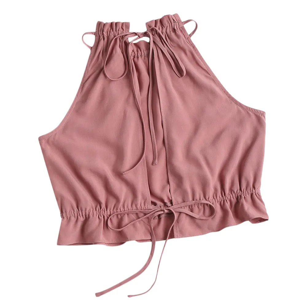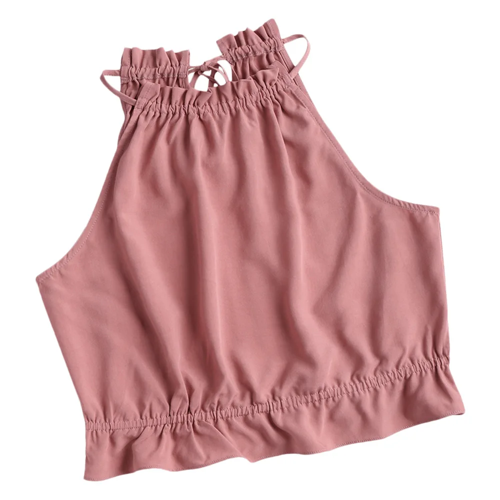 Wipalo Solid Ruffles Women Summer Tank Top Ruched Neck Self-Tied Strap Sleeveless Frilled Trim Crop Tops Sweet 2018 Cami Tops