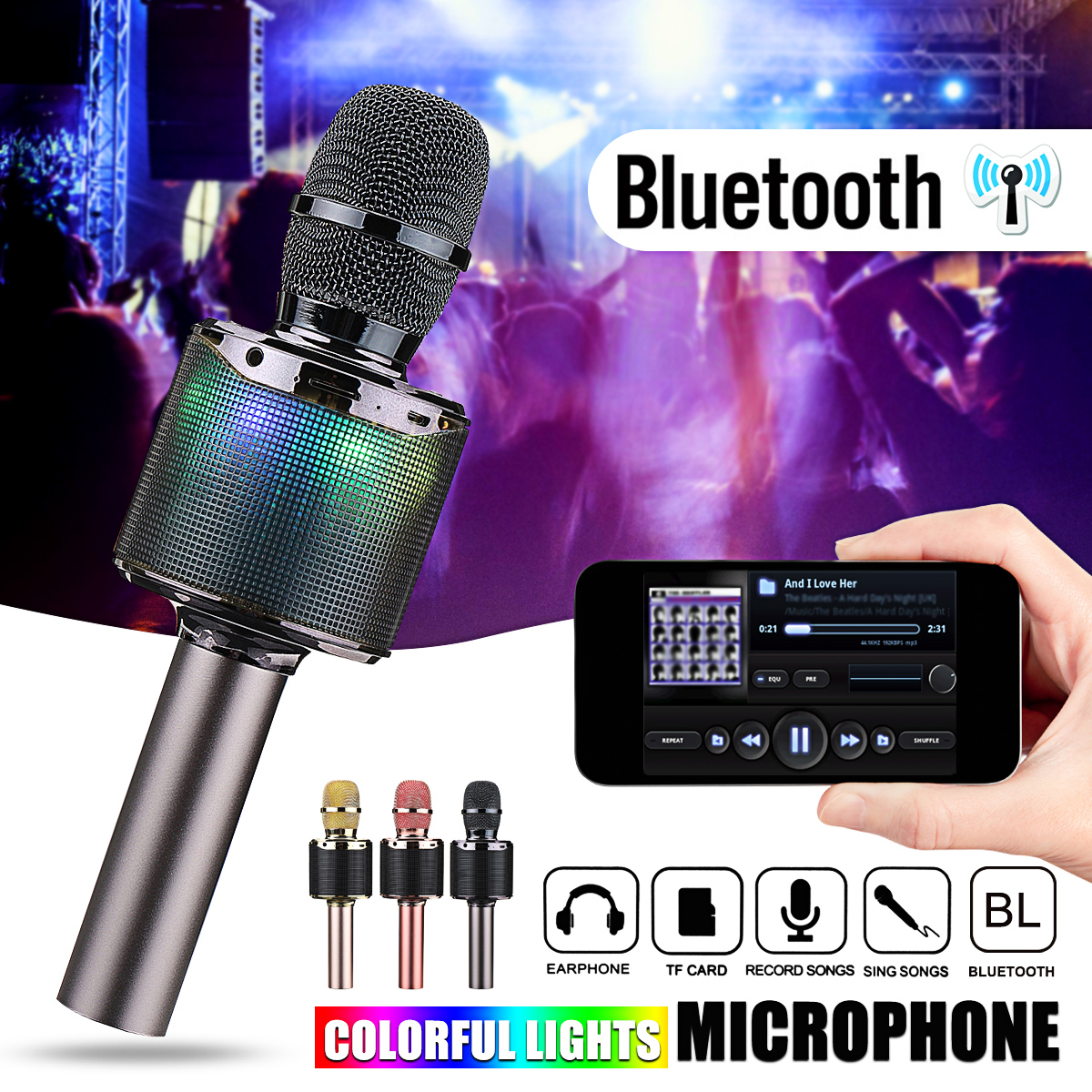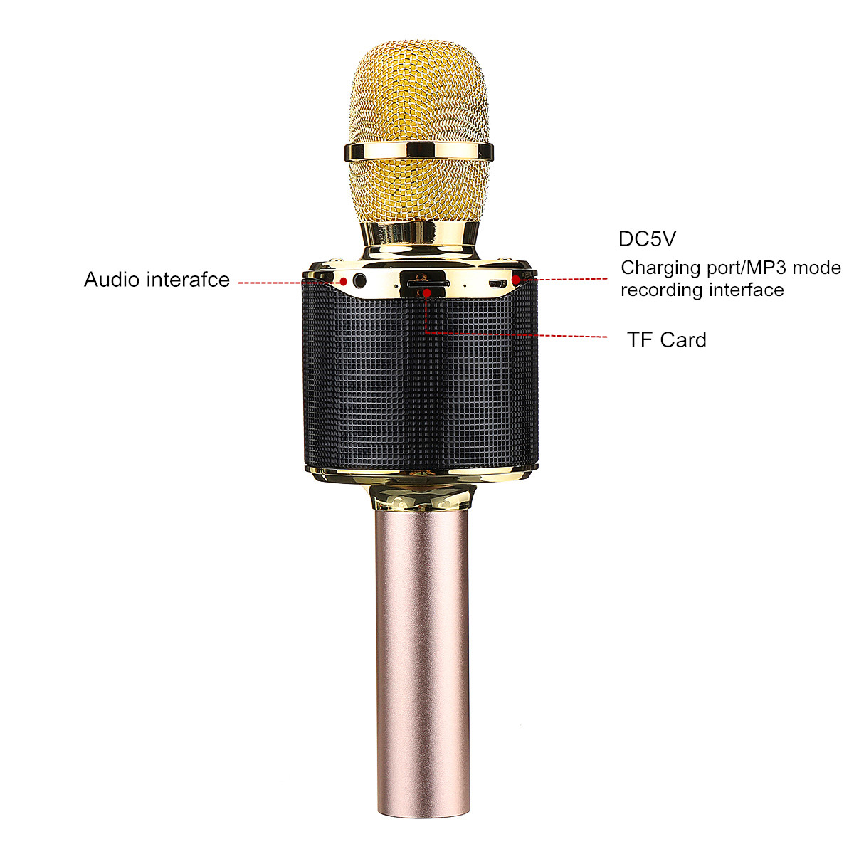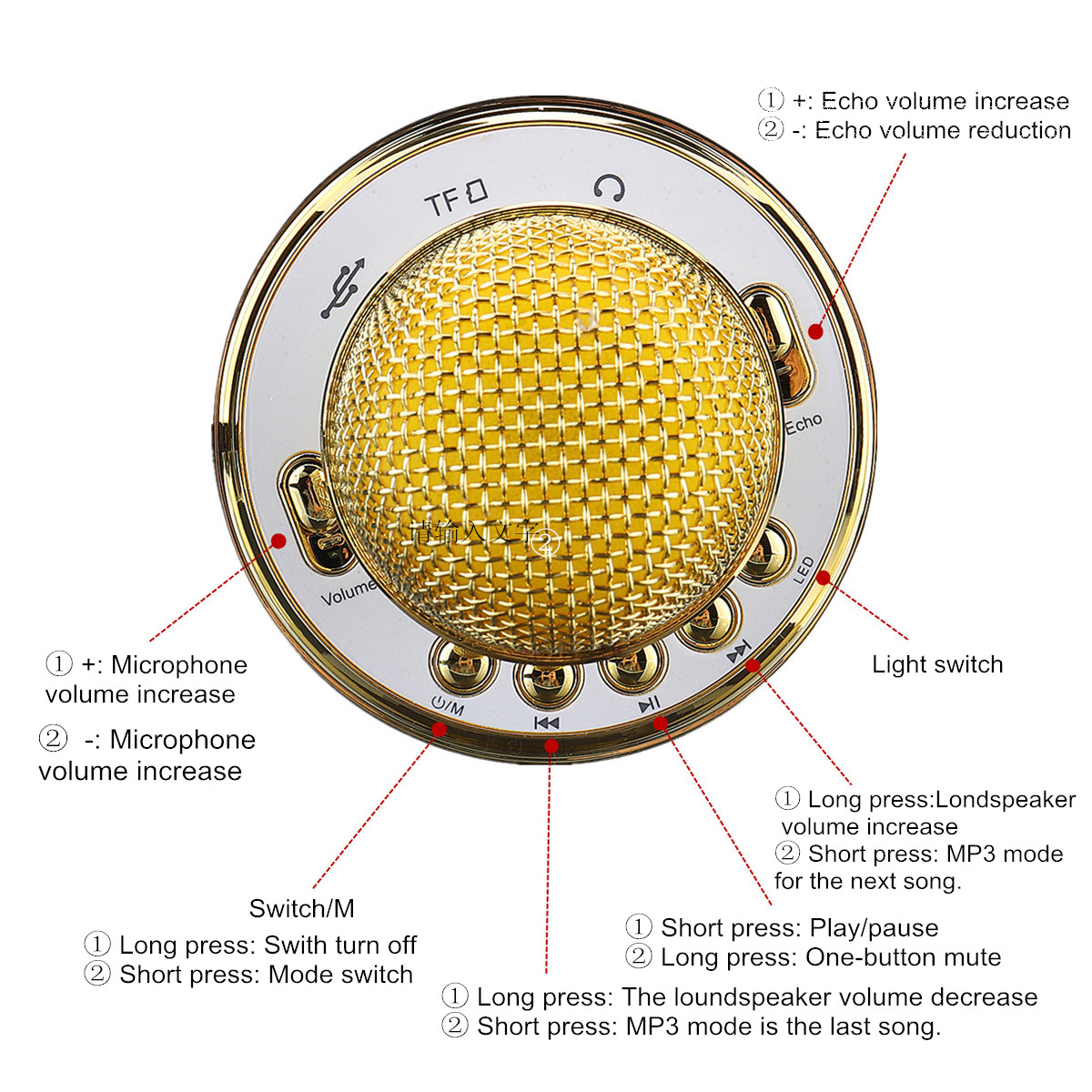 — Support MP3. There is a USB input port at the bottom of the microphone, which supports MP3 format music playback, and the function is extremely powerful.