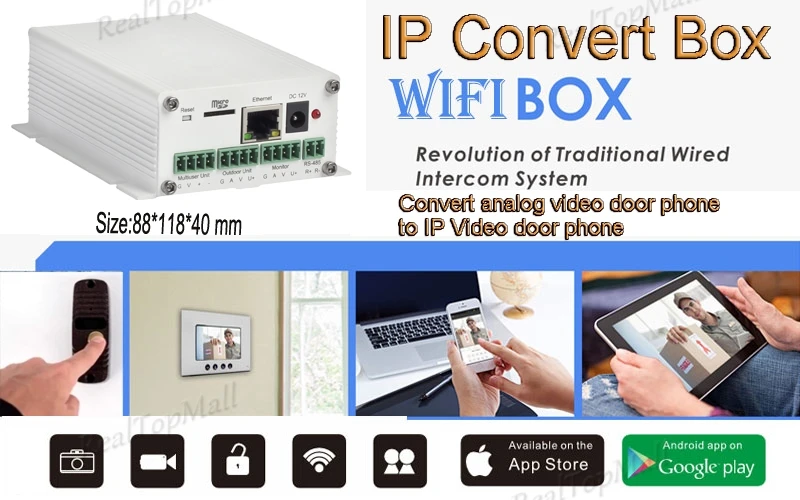 Wireless WiFi IP BOX For Video Doorphone Doorbell Building Intercom System Kit Any Where Control 3G 4G Android iPhone APP on Smart Phone Support IOS Android iPad Smart Phone Tablet APP. 1 X IP WiFi BOX