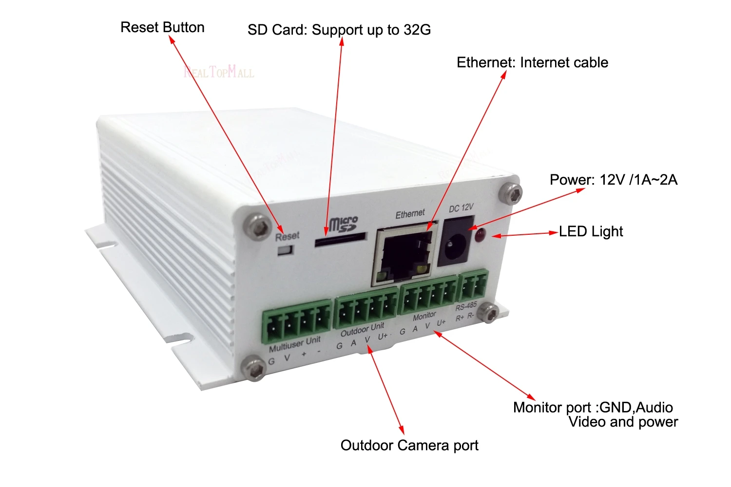 connection For wired video door phone with wifi IP box . Adapter : 12V 1A ~2A Sd Cards support : up to 32G