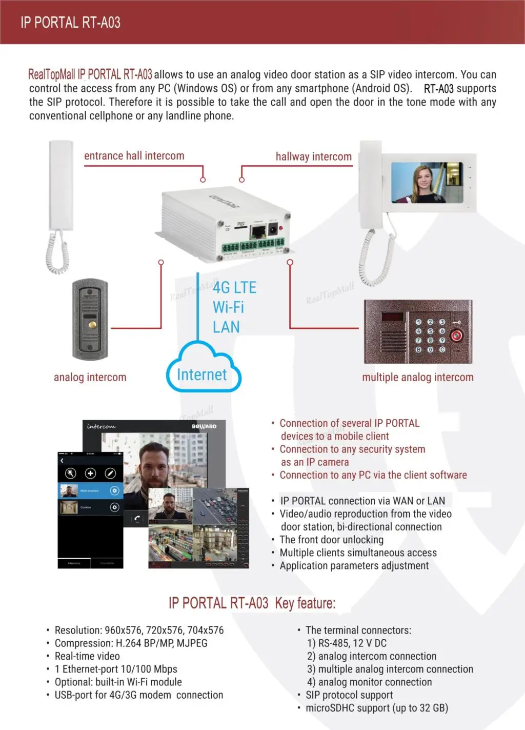 Monitor/Answer/Control your analog intercom remotely over IP/SIPIP Portal RT-A03 allows to use an analog video door station as a SIP video video intercom. You can control the access from any PC, or from any smartphone . RT-A03 SUPPORTS the sip protocol,Therefore it is possible to take the call and open the door in the the tone mode with any conventional cellphone or any landline phone.