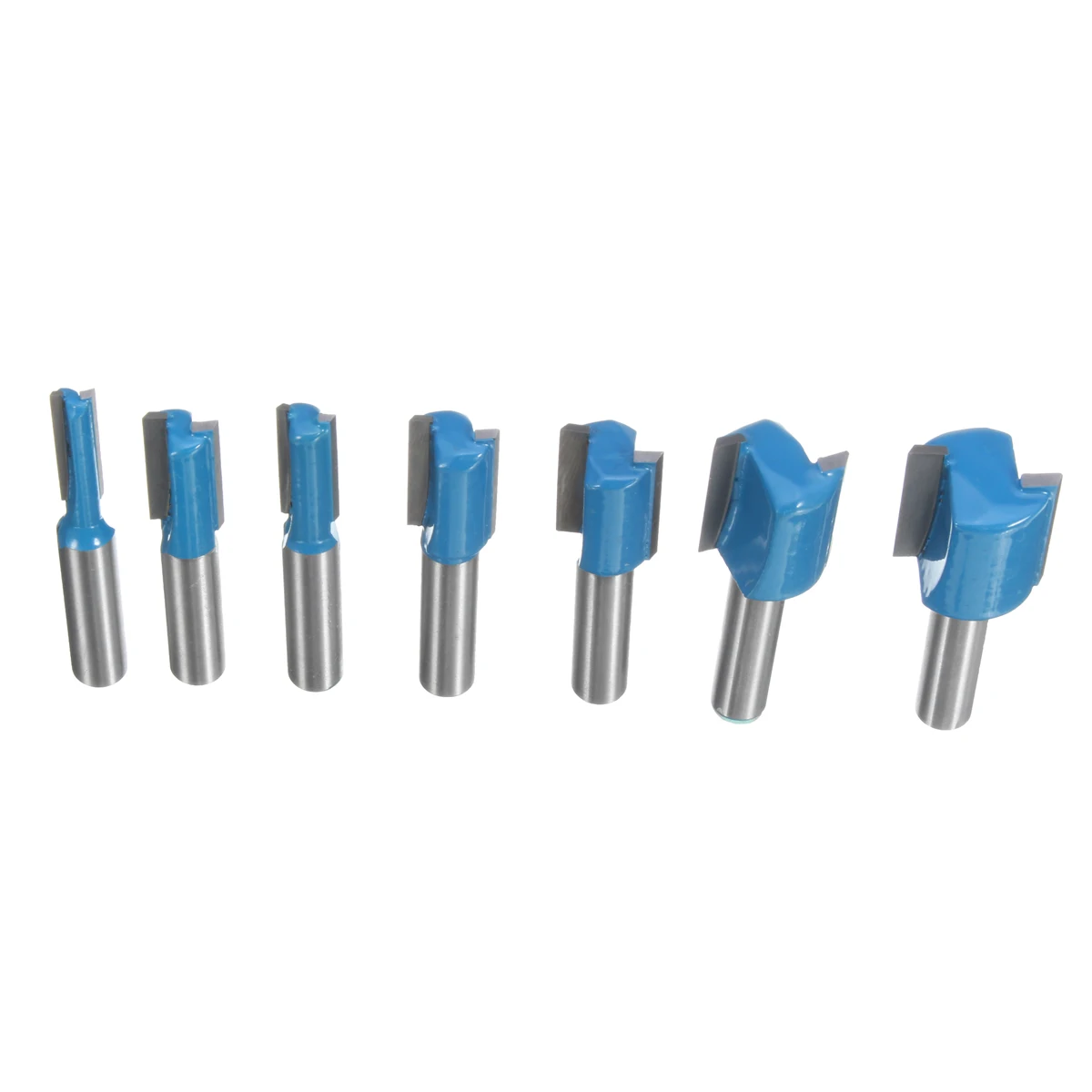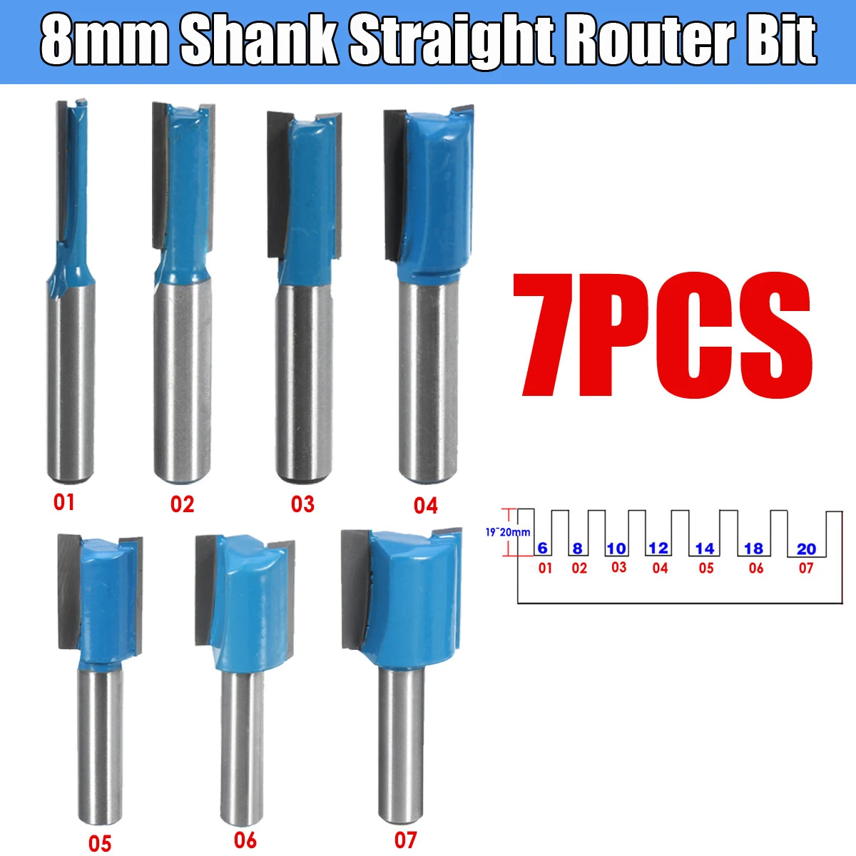 Wolke 7Pcs 8mm Shank Straight Router Bit Set 6mm/8mm/10mm/12mm/14mm/18mm/20mm Diameter Blue Milling Cutter for Wooden Cutting