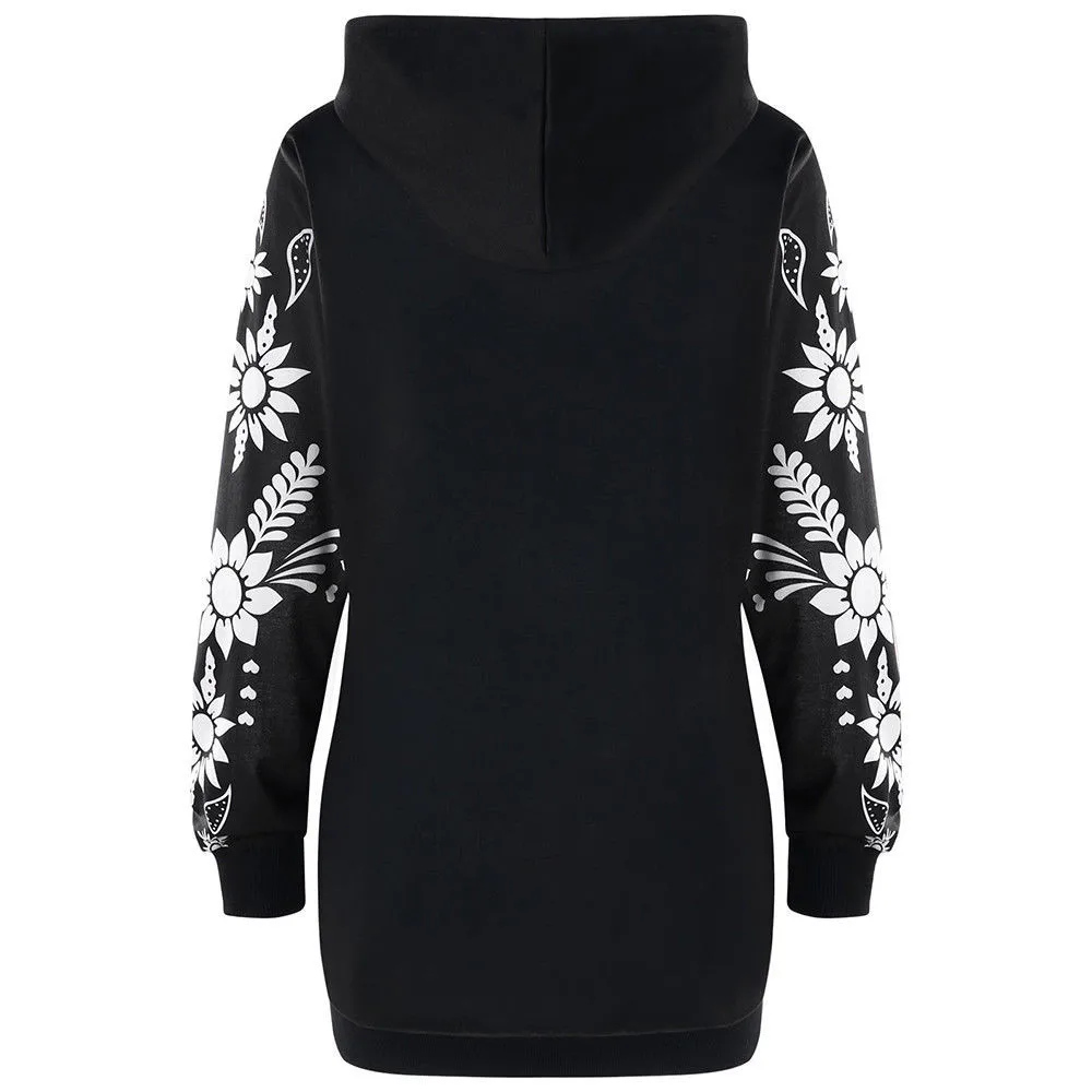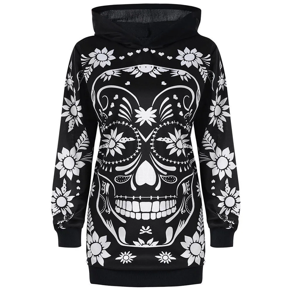 Women Monochrome Hoodie Floral Skull Tunic Hoodie Sweatshirt Tops Shirt