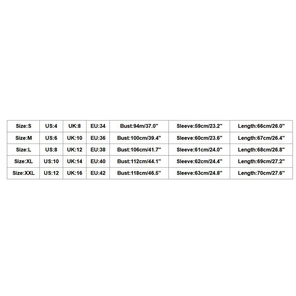 Size:XXL US:12 UK:16 EU:42 Bust:118cm/46.5″ Sleeve:63cm/24.8″ Length:70cm/27.6″