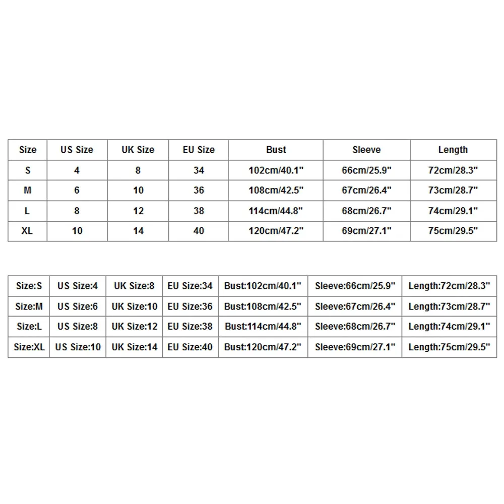 Size US Size UK Size EU Size Bust Sleeve Length