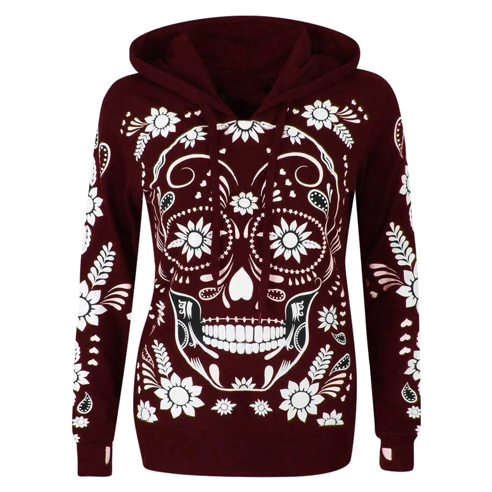 Women Autumn Hoodie Casual Plus Size Long Sleeve Skull Print Hooded Sweatshirt Pullover Blouse Tops Long Sleeve Sweatshirts