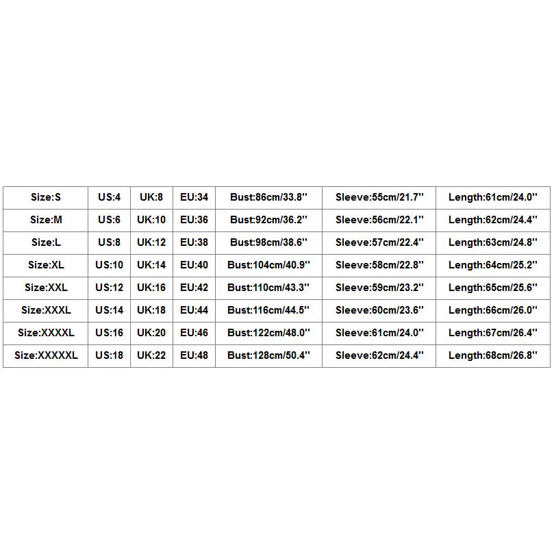 Size US UK EU Bust Sleeve Length