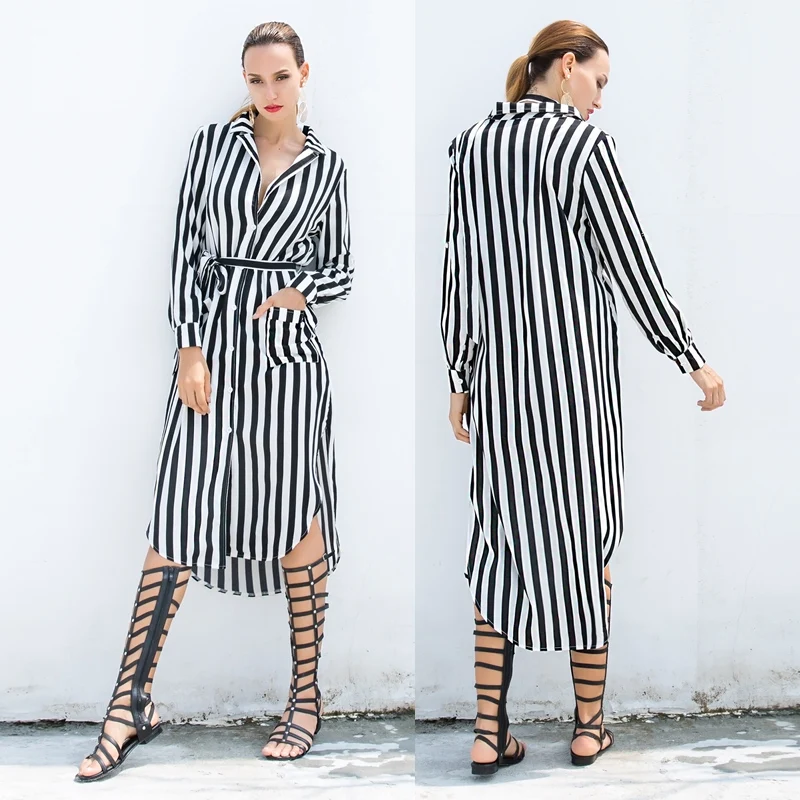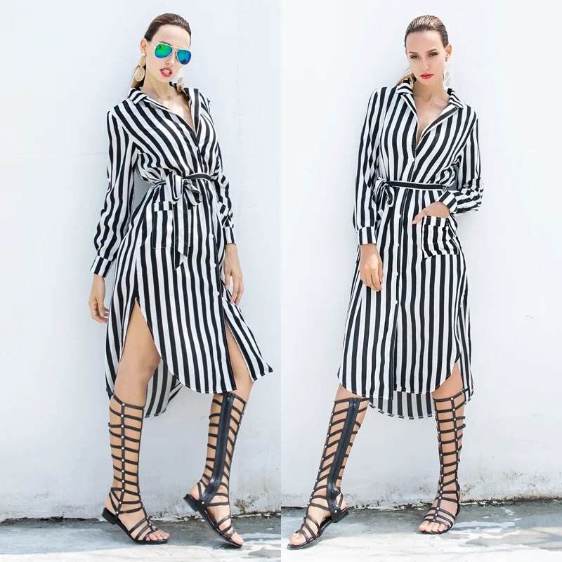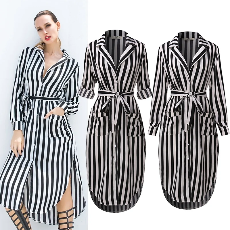 Women Autumn Short Shirt Dresses Half Sleeve Loose Turn-Down Collar Party Dress Striped High Waist Split Casual Button Dress