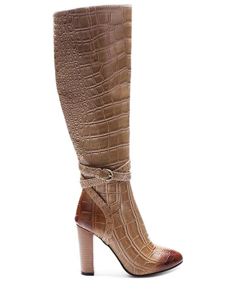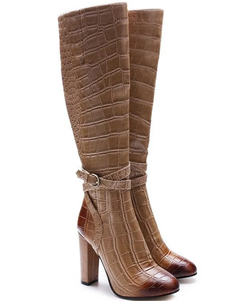 Name : Women Fashion Patchwork Color Snake Leather Design Thick Heel Knee High Boots Buckle Design Mix-color Long Boots