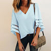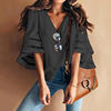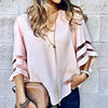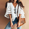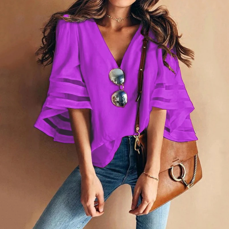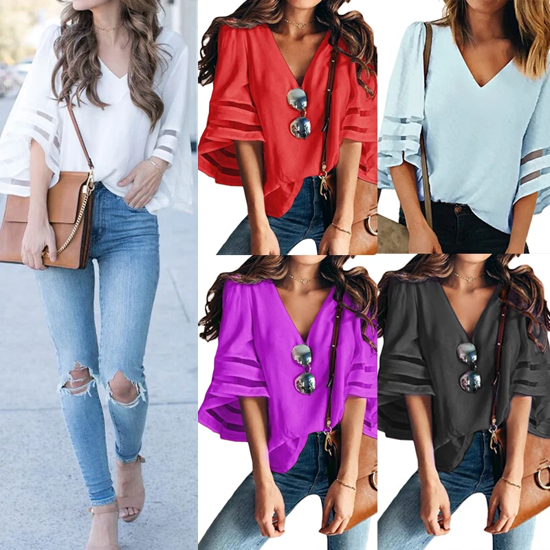 Product Description: Womens V Neck Trumpet Sleeve Chiffon Loose Tops