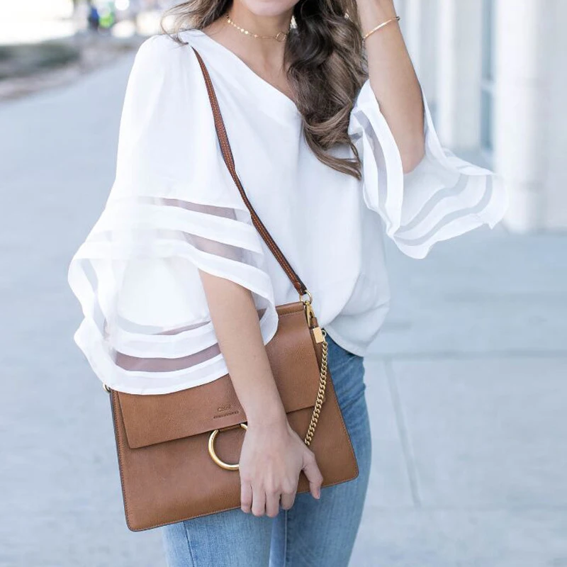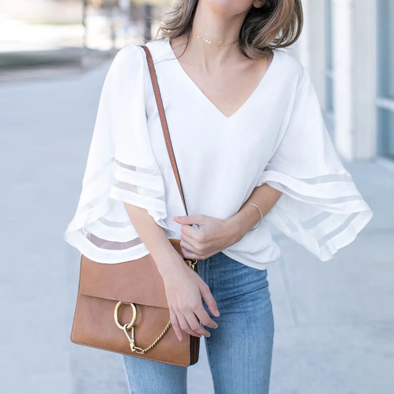 Women Flare Sleeve Chiffon Blouses Camisa Feminina 2018 Summer Mesh Top V-Neck Tunic Tops Ladies Office Shirt Formal Blusas