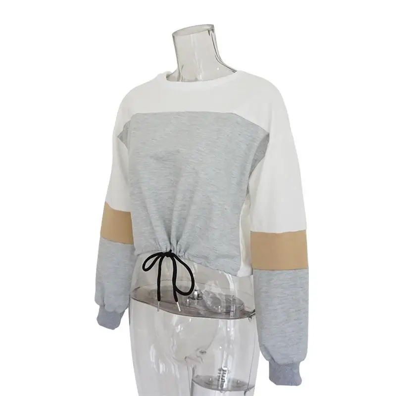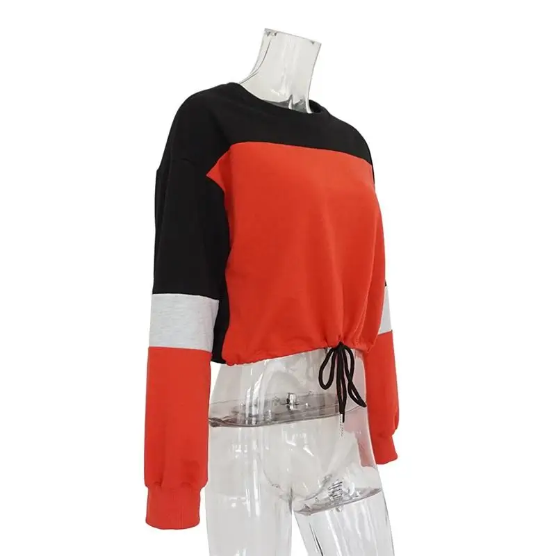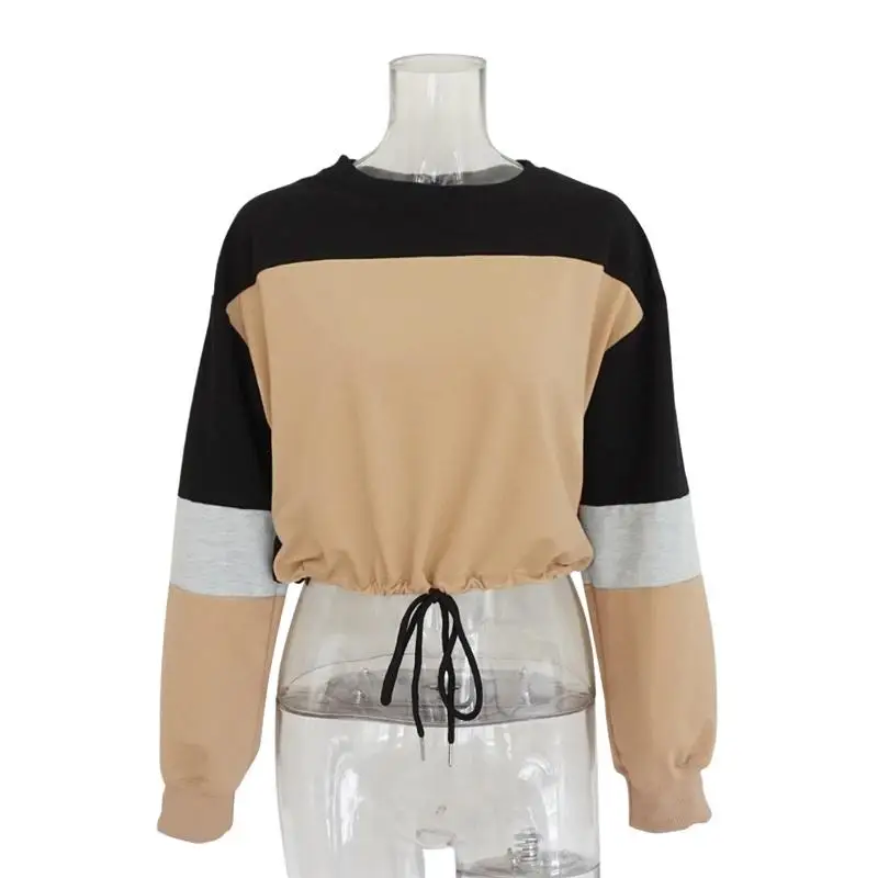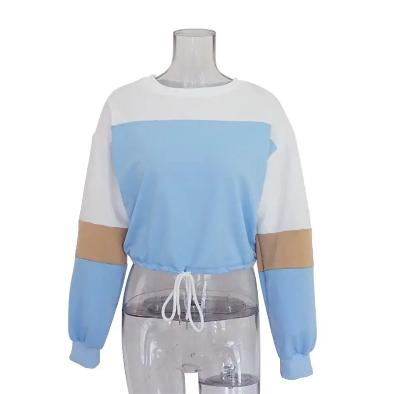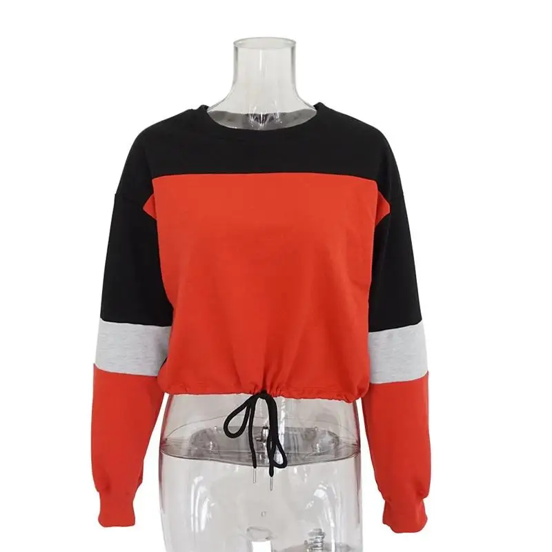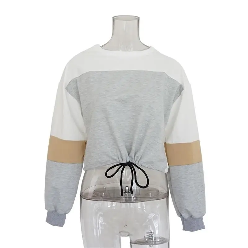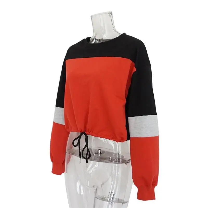Women Hoodies 2018 Round Neck Stitching Long Sleeve Strap with Navel Knitted Sweatshirts Causal Female Crop Tops Hooded Shirts