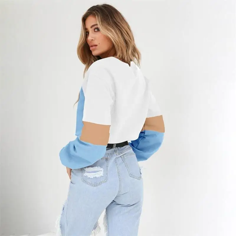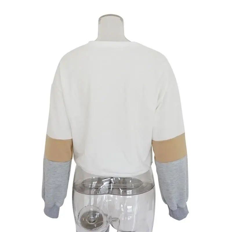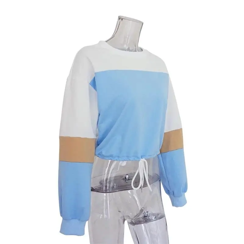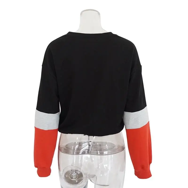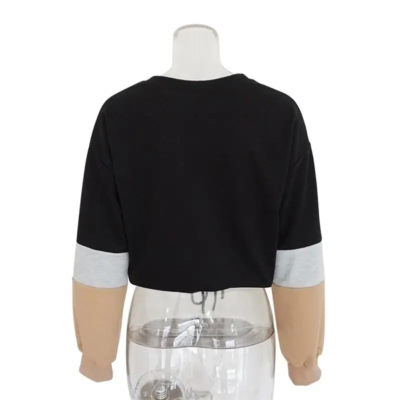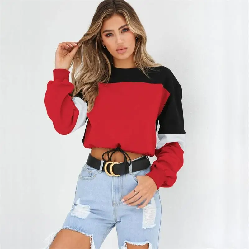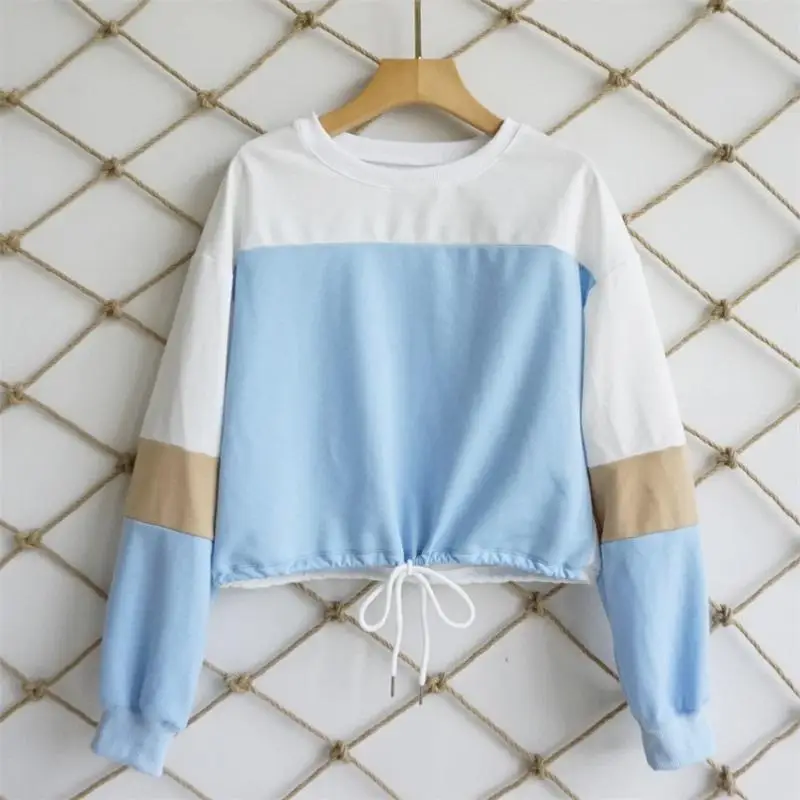 Women Hoodies 2018 Round Neck Stitching Long Sleeve Strap with Navel Knitted Sweatshirts Causal Female Crop Tops Hooded Shirts
